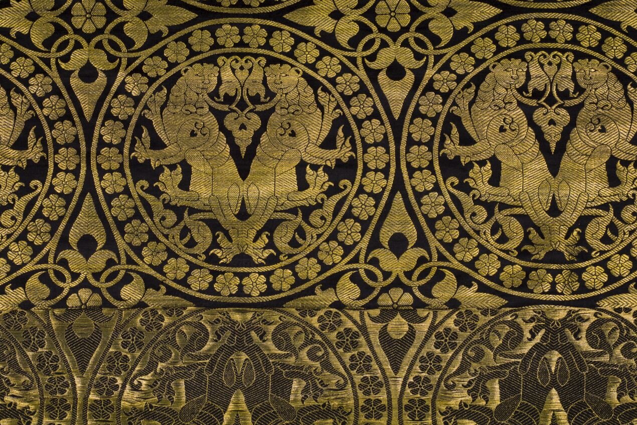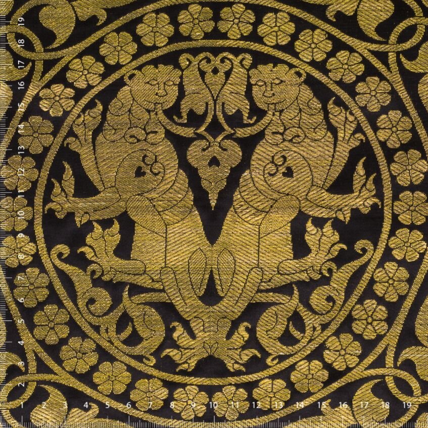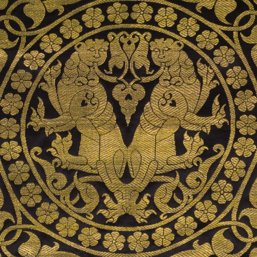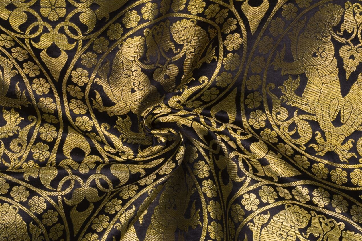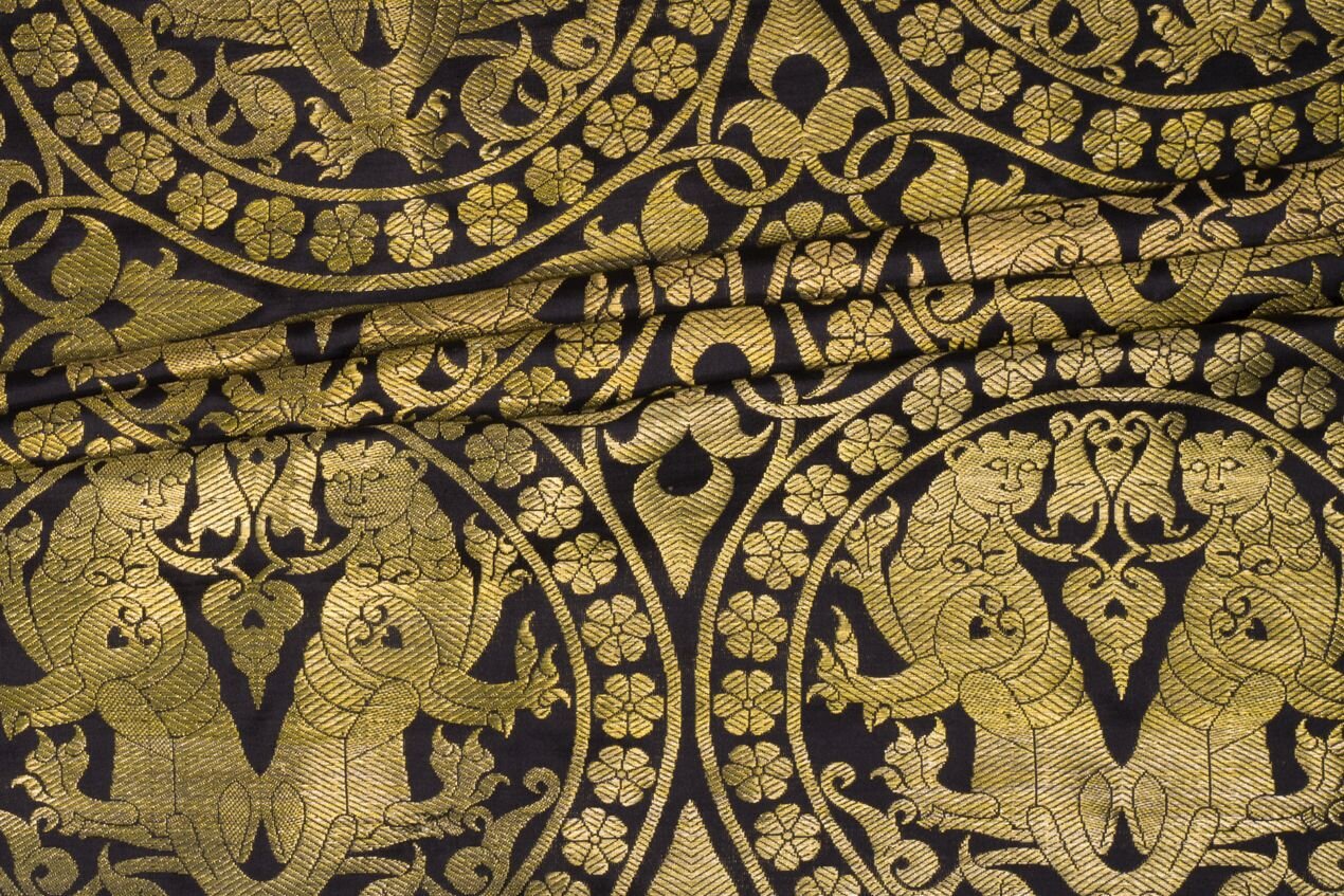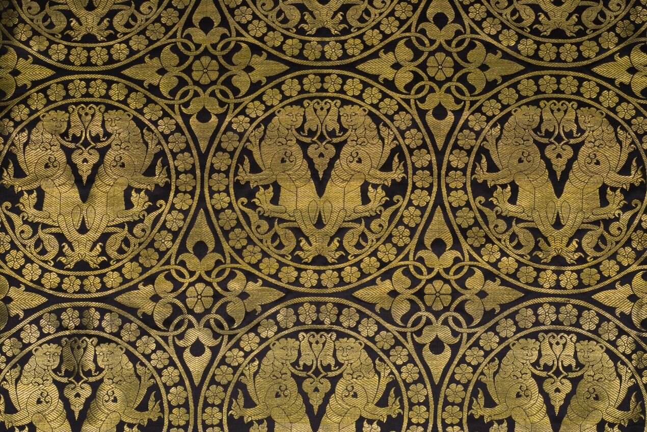 Hand woven reproduction of historical fabric from 13th century Asia Minor in genuine silk and gold thread. Gold pattern on a black field. Perfect for historical costuming or to bring something special to modern interiors and fashions.