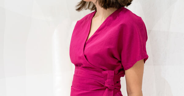 Hand sewn bias tape on the inside of a linen dress. The photo is from our post how to sew a linen wrap dress.