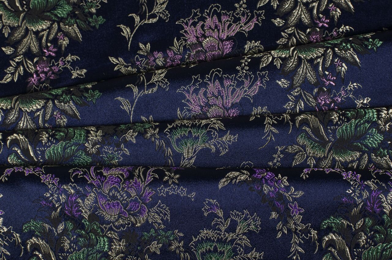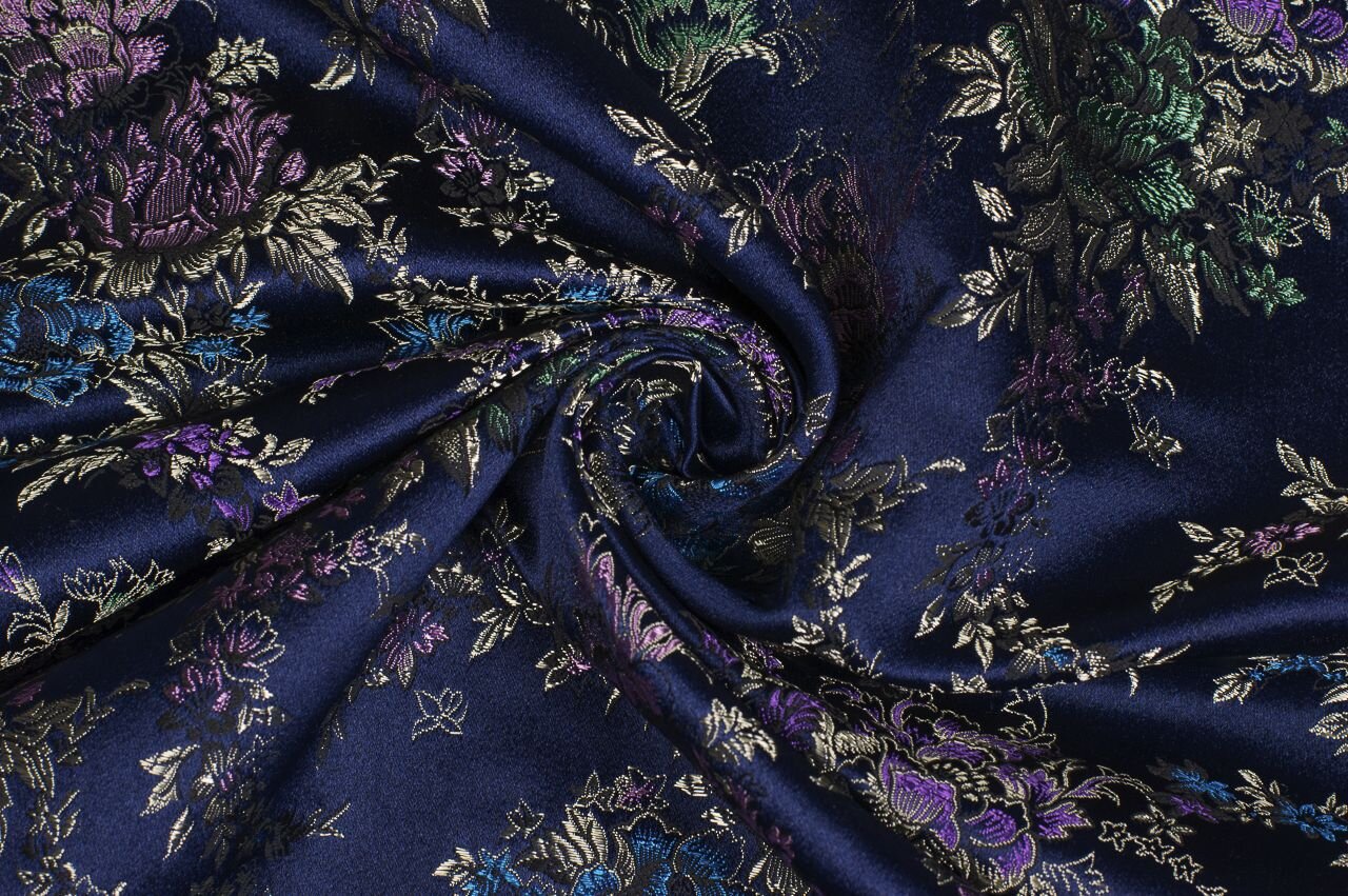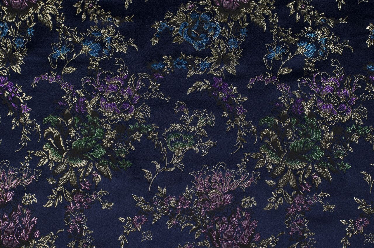 This dark blue brocade is a beautiful, opulent fabric created using the jacquard technique, which makes the production of highly detailed, woven patterns possible. Its intense colors, effective combination of matte and luster, and tactile surface, put it in a class of its own. Historically, brocade has always numbered among prestige fabrics, and that remains true to this day.