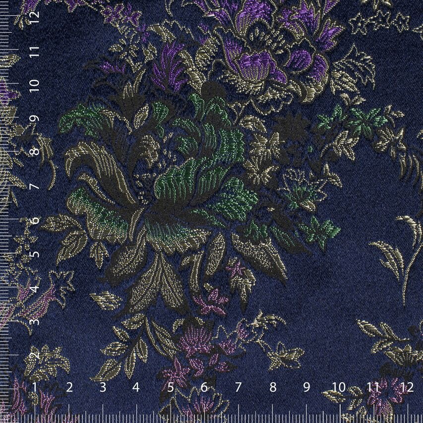 A sturdy, luxurious fabric with a detailed brocaded pattern in dark blue. This brocade has a moderately crisp hand, making it a good choice for tailored patterns that have to hold their shape. Use it for formal gowns, skirts, corsets or vests.
