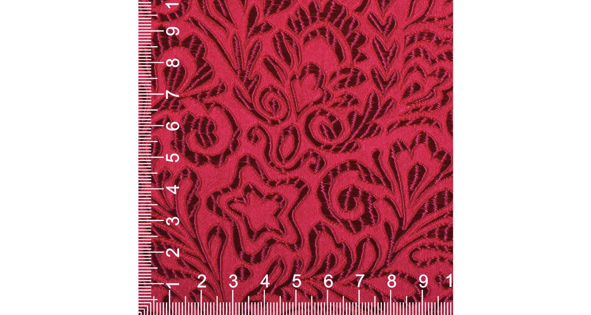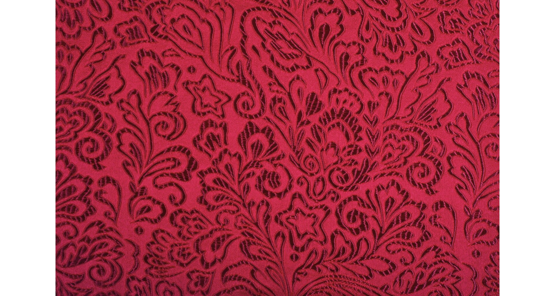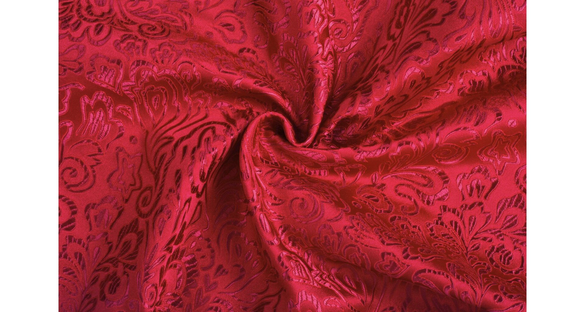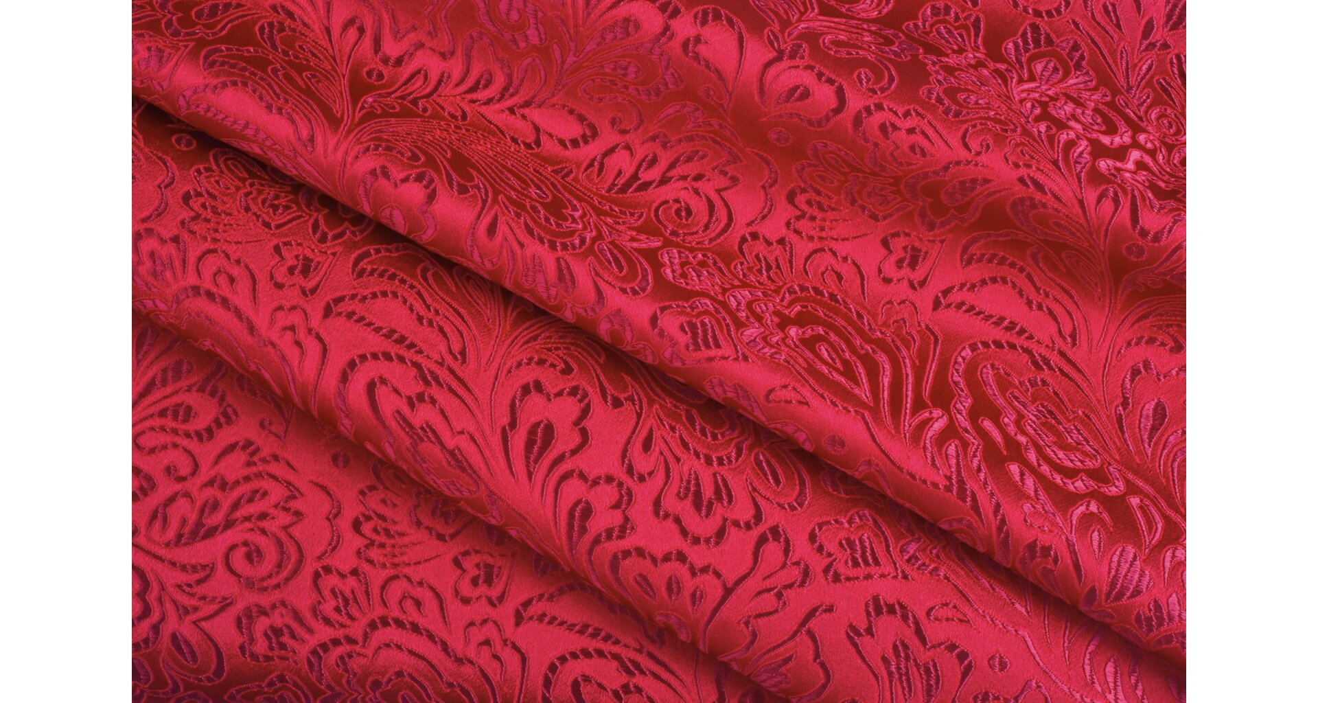 A sturdy, luxurious fabric with a detailed brocaded pattern in crimson. This brocade has a moderately crisp hand, making it a good choice for tailored patterns that have to hold their shape. Use it for formal gowns, skirts, corsets or vests.