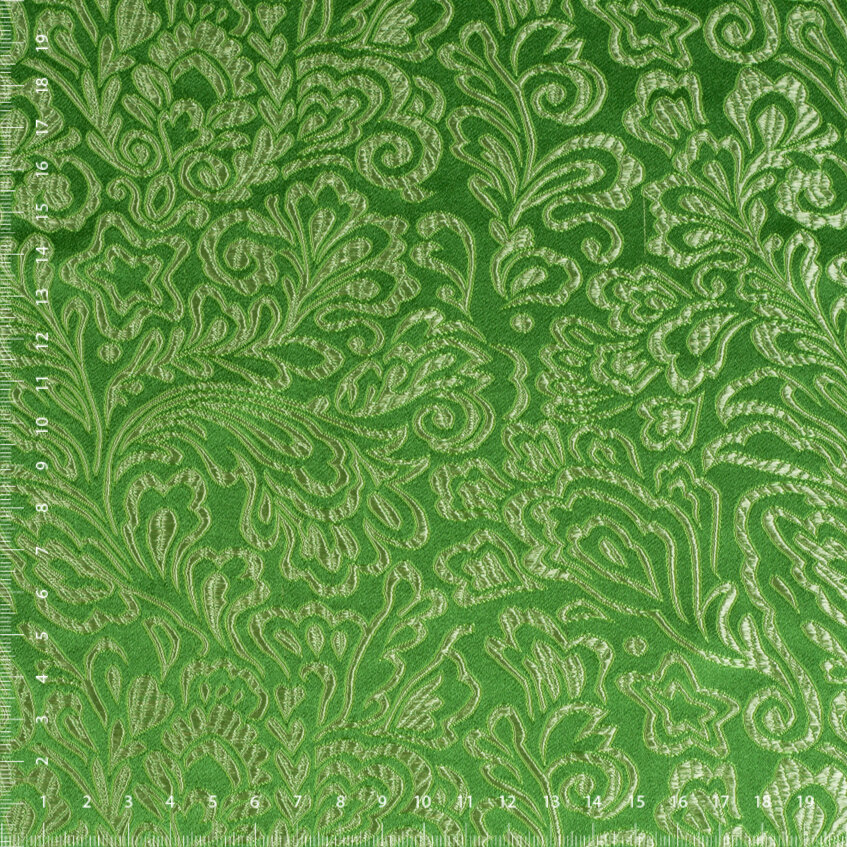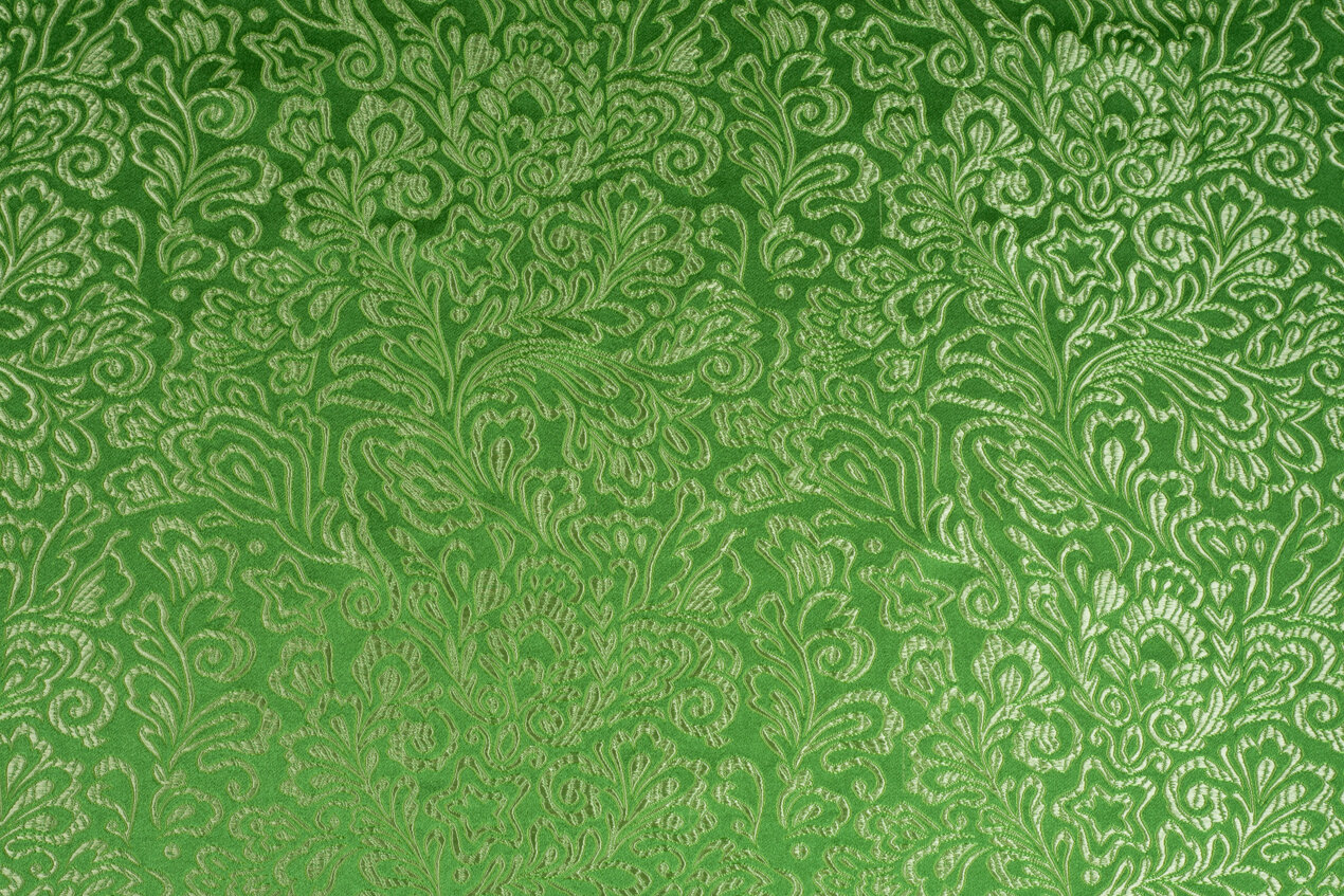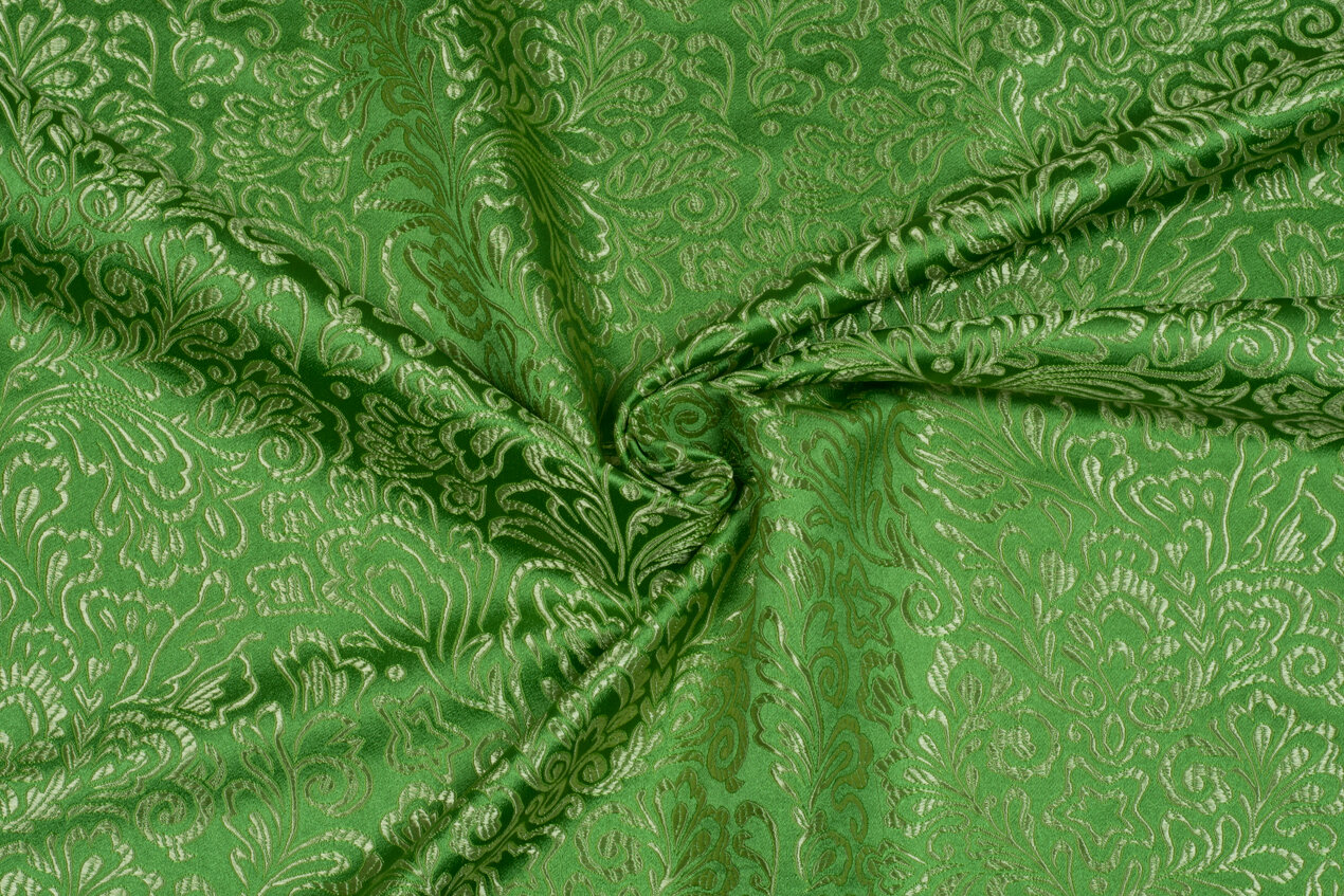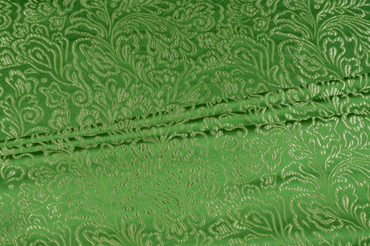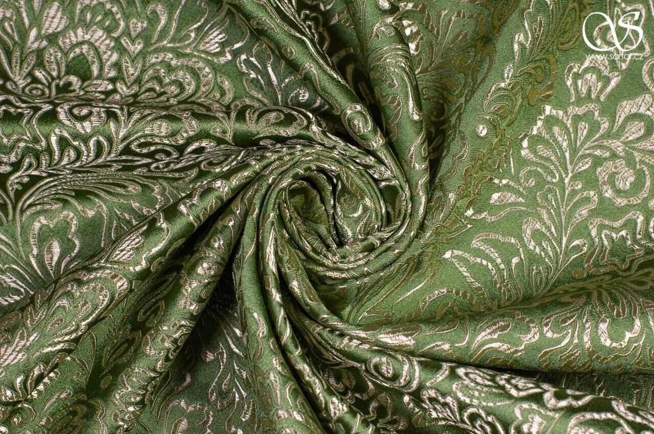 This olive and gold brocade is a beautiful, opulent fabric created using the jacquard technique, which makes the production of highly detailed, woven patterns possible. Its intense colors, effective combination of matte and luster, and tactile surface, put it in a class of its own. Historically, brocade has always numbered among prestige fabrics, and that remains true to this day.
