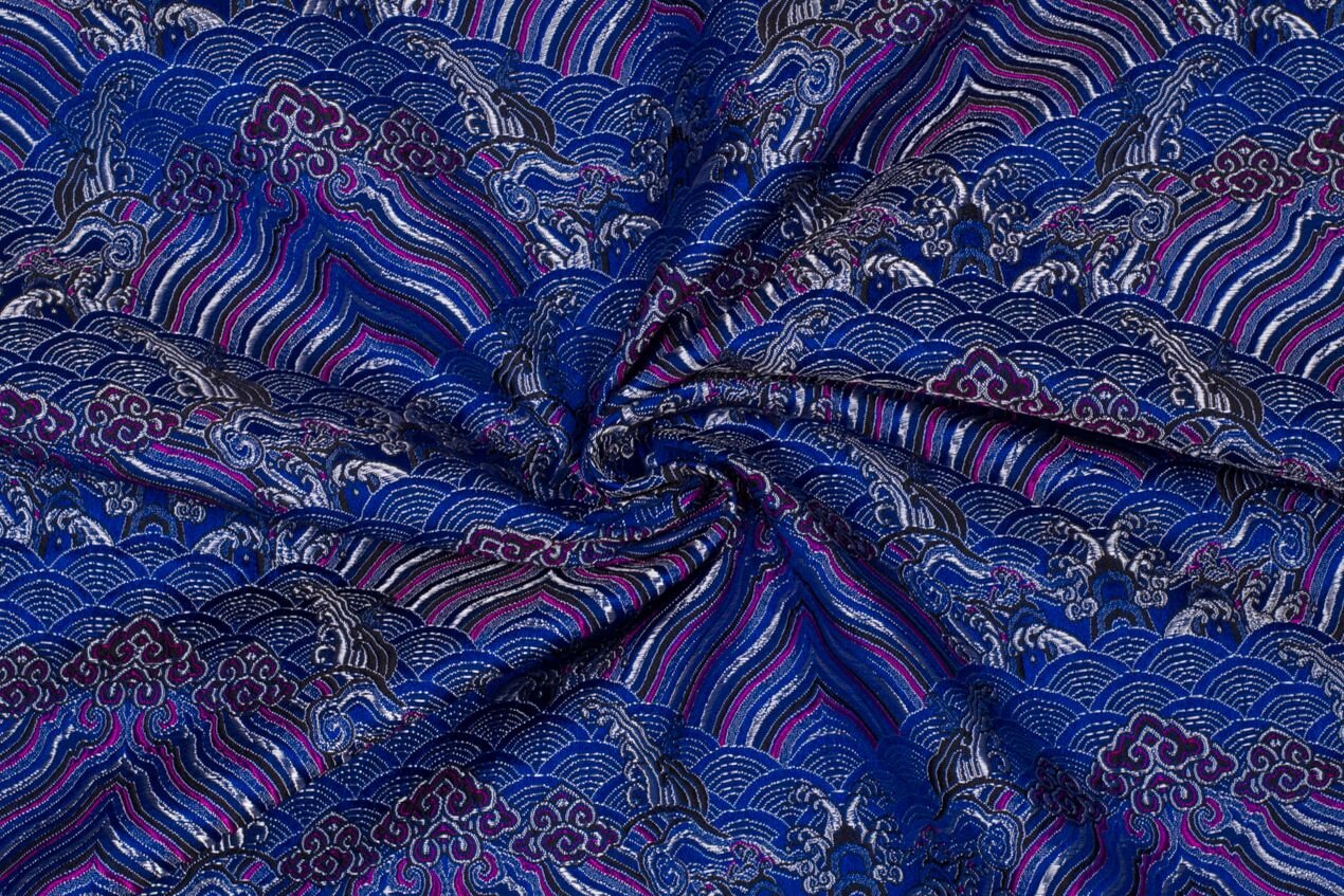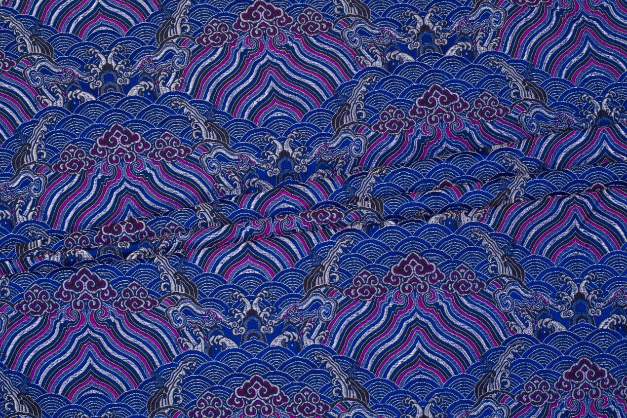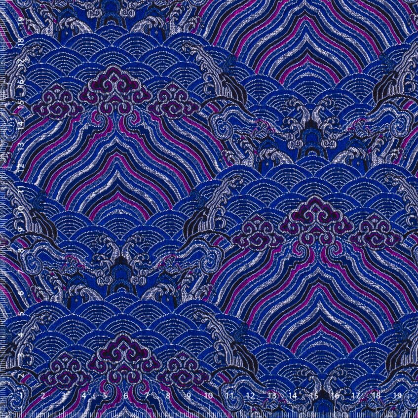 A sturdy, luxurious fabric with a detailed brocaded pattern in blue, pink and white. This brocade has a moderately crisp hand, making it a good choice for tailored patterns that have to hold their shape. Use it for formal gowns, skirts, corsets or vests.