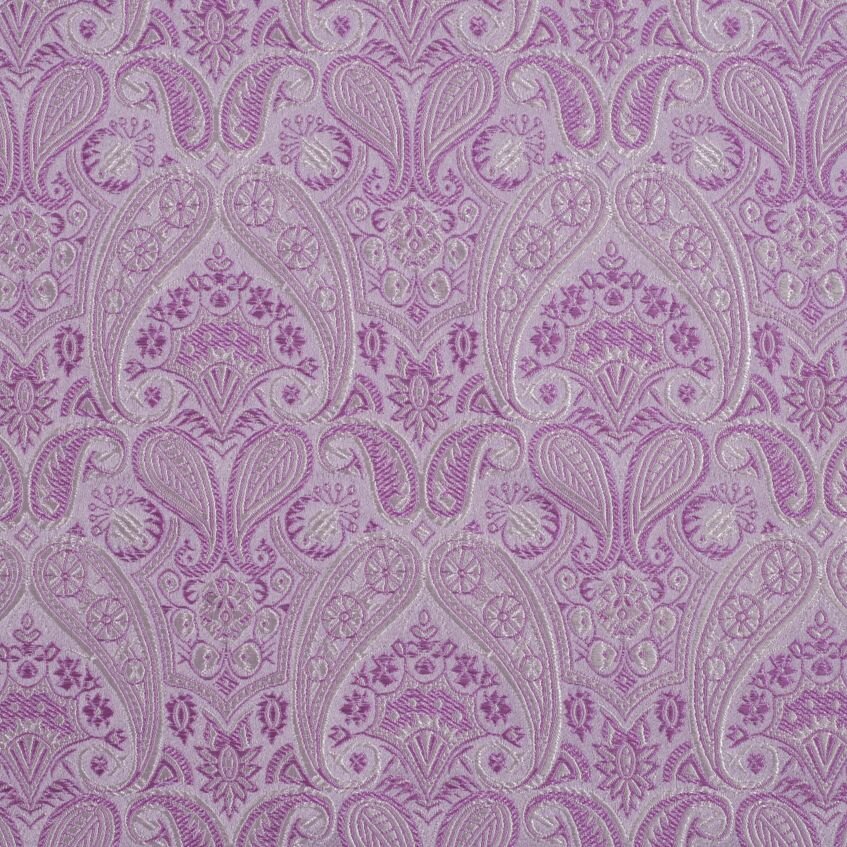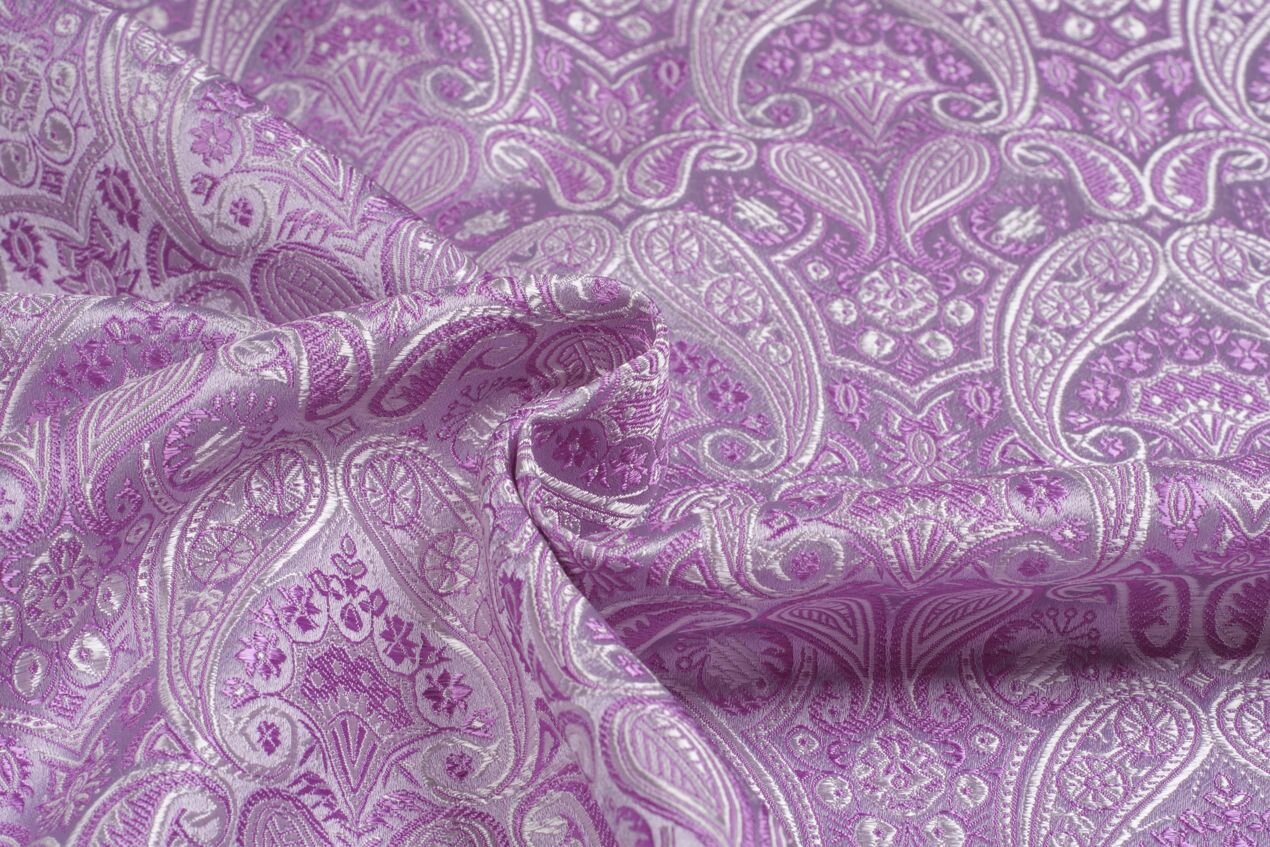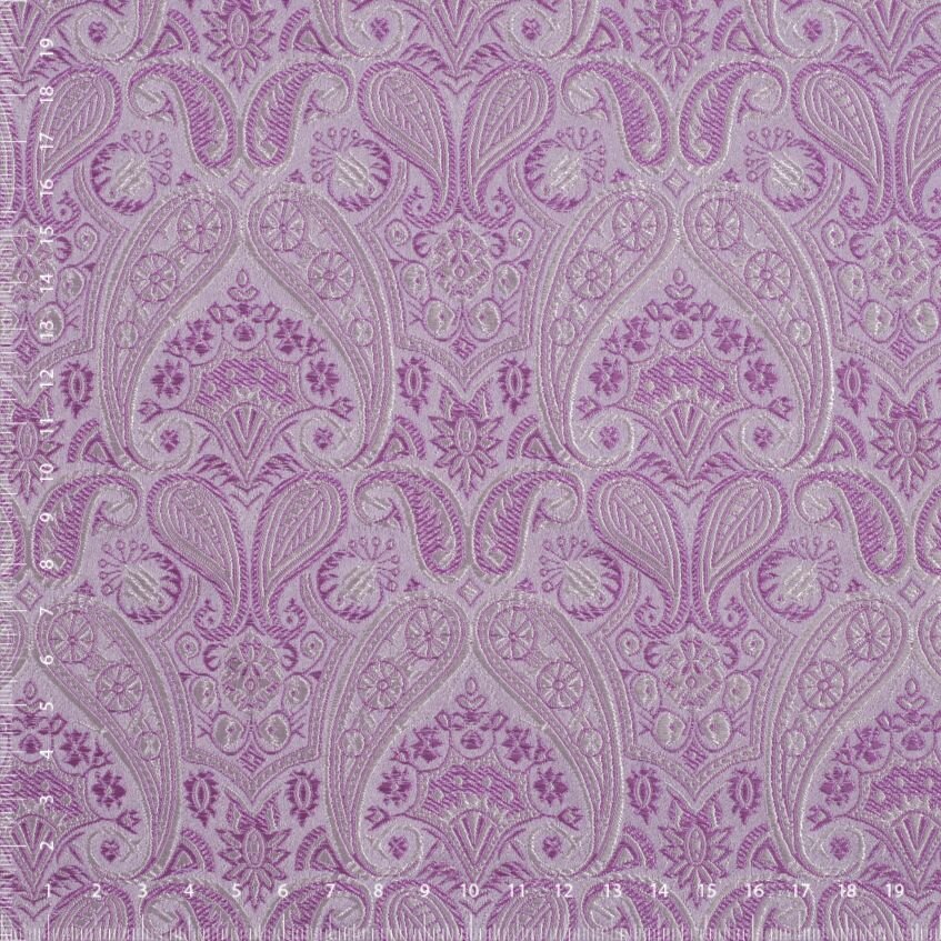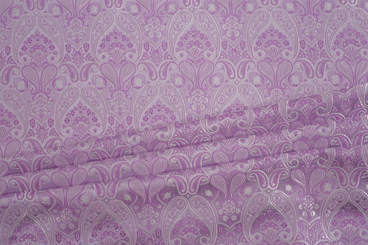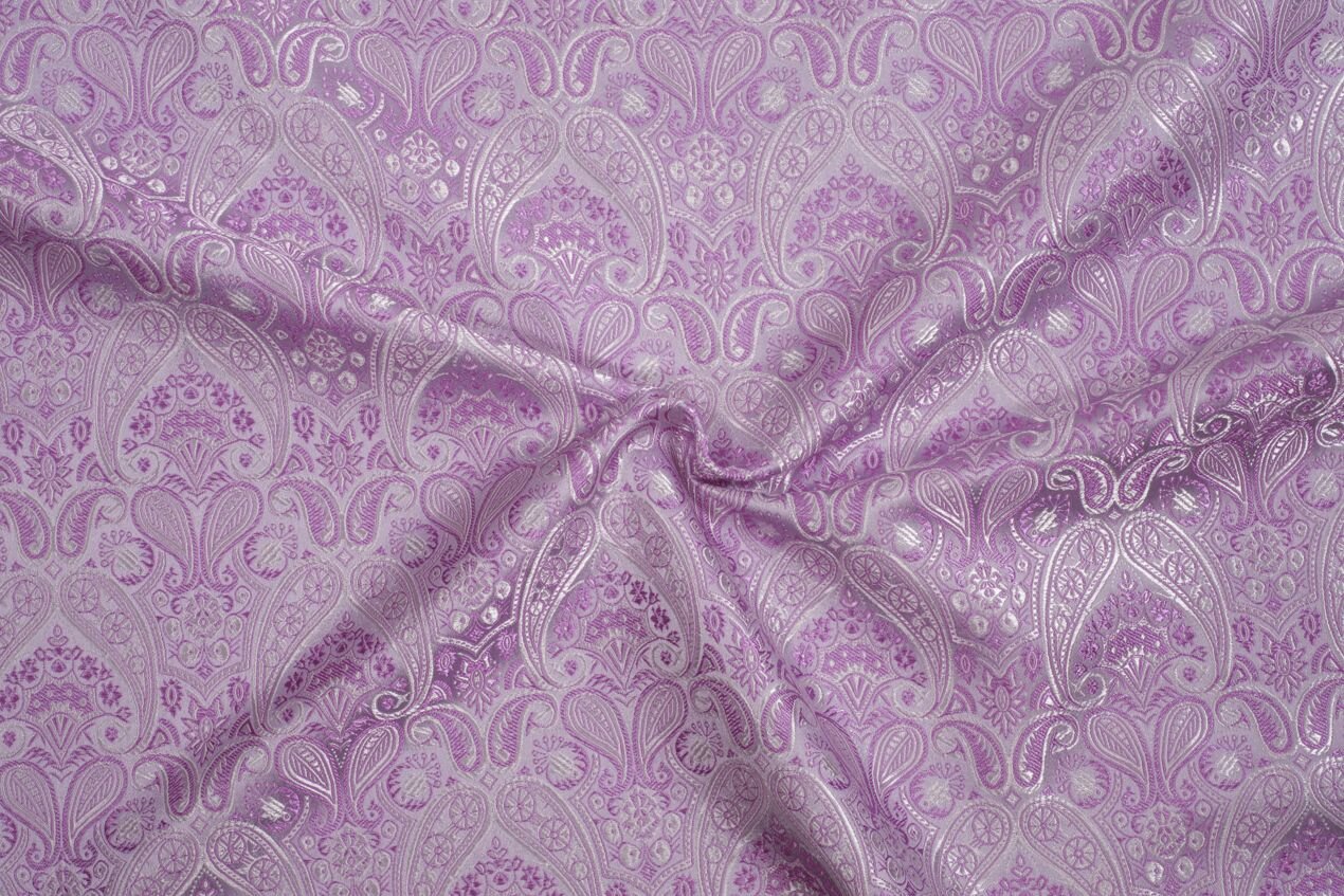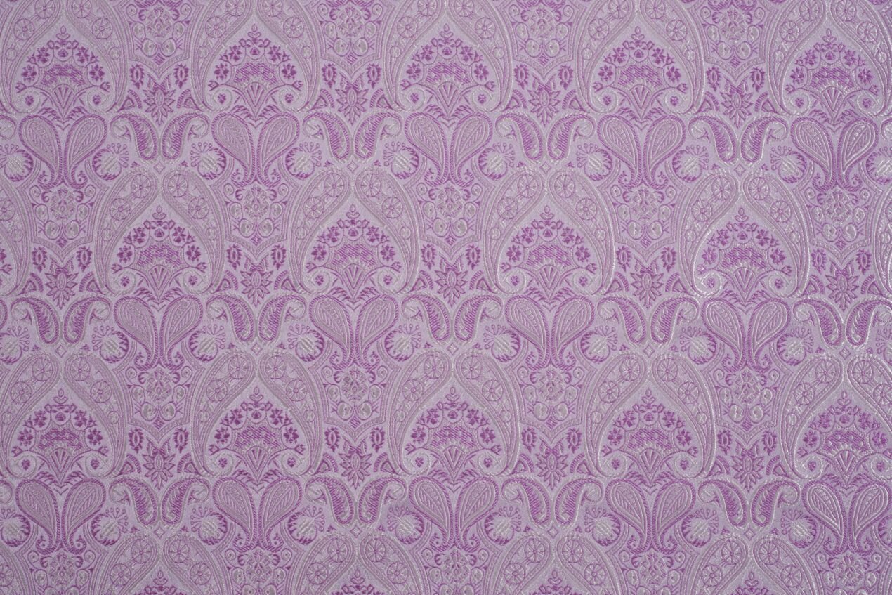 A sturdy, luxurious fabric with a detailed brocaded pattern in lilac. This brocade has a moderately crisp hand, making it a good choice for tailored patterns that have to hold their shape. Use it for formal gowns, skirts, corsets or vests.
