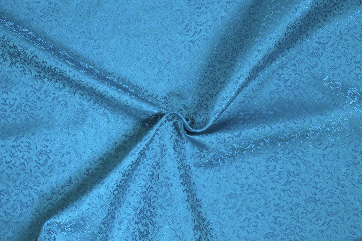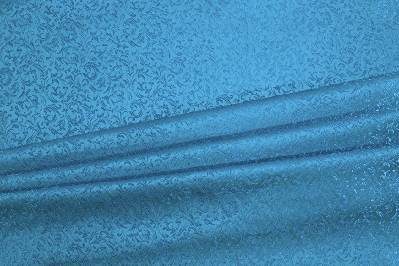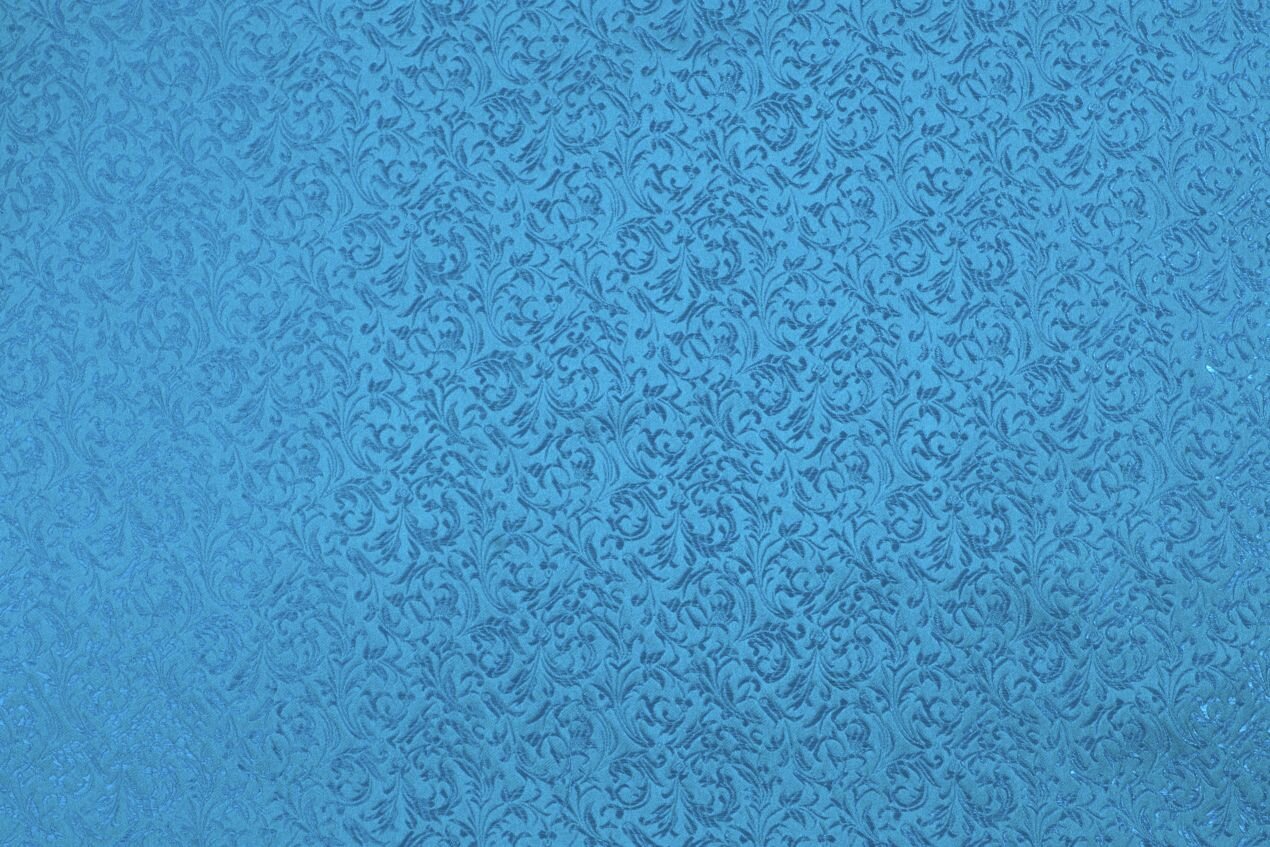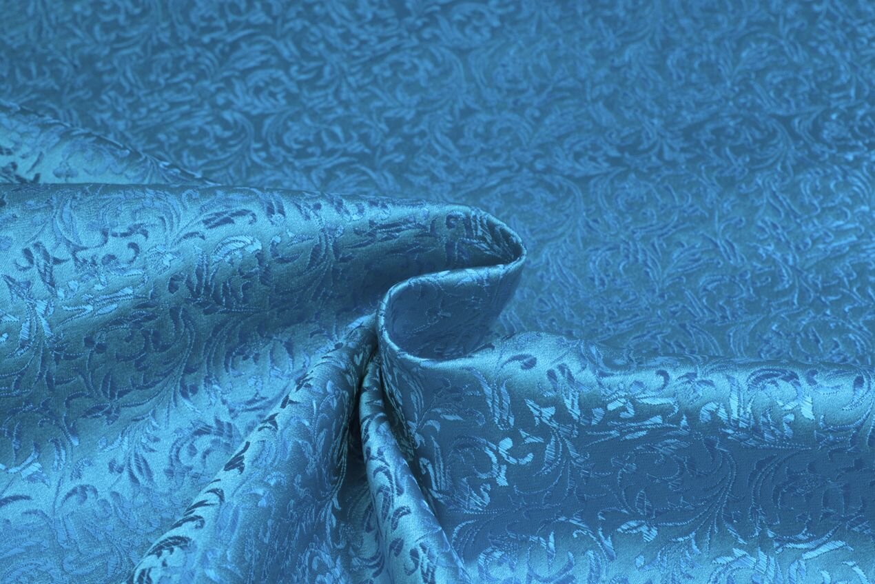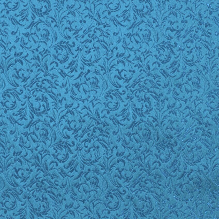 A sturdy, luxurious fabric with a detailed brocaded pattern in blue. This brocade has a moderately crisp hand, making it a good choice for tailored patterns that have to hold their shape. Use it for formal gowns, skirts, corsets or vests.