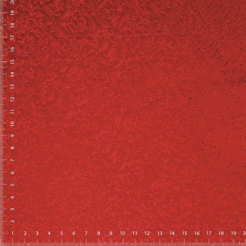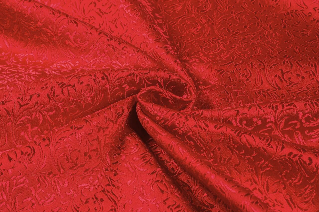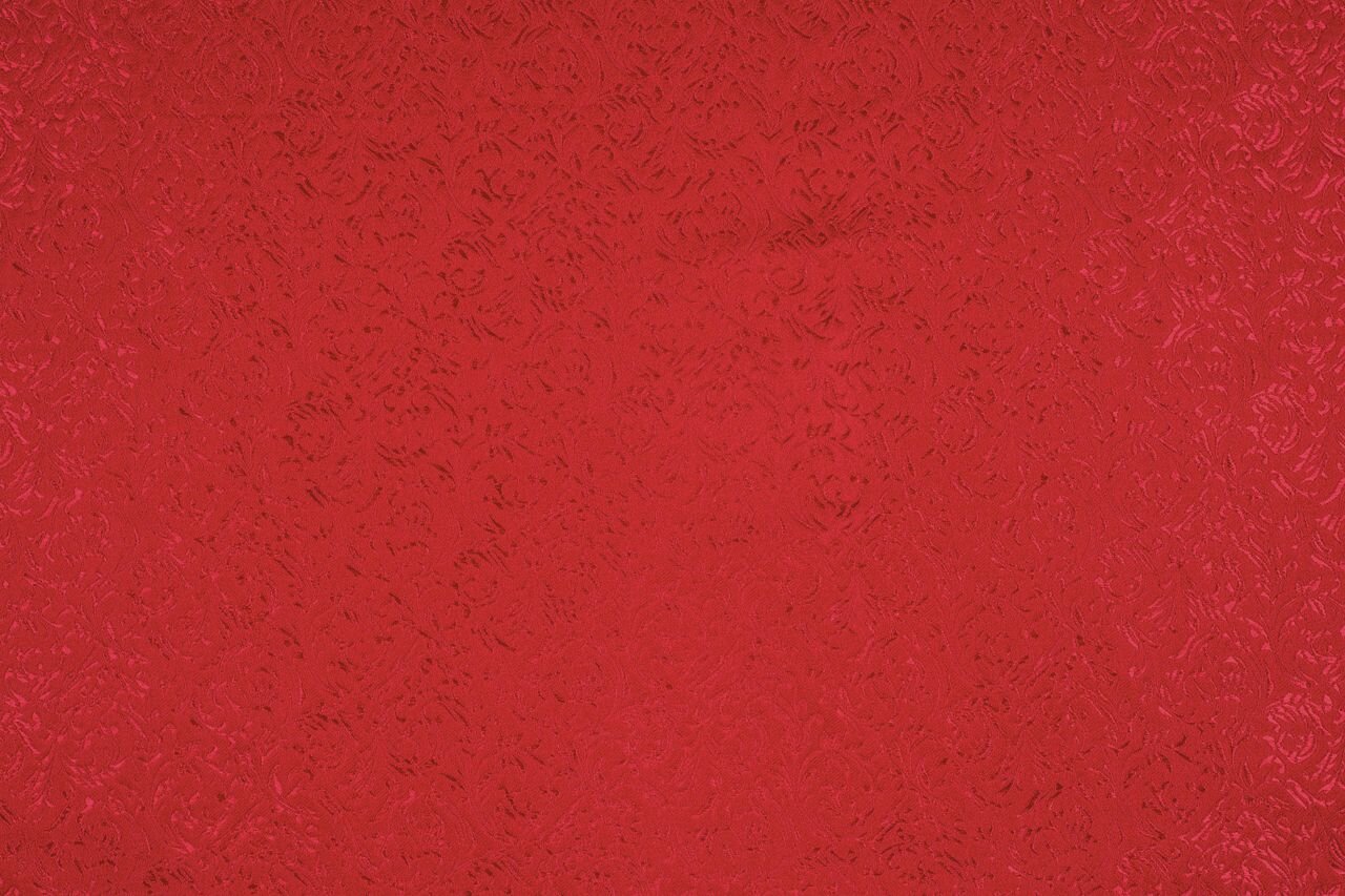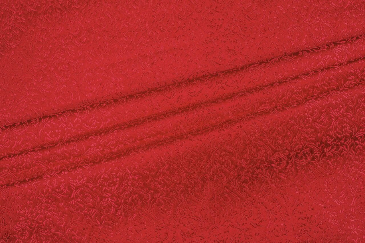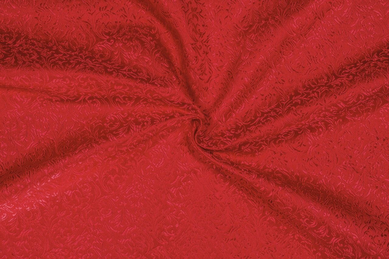 A sturdy, luxurious fabric with a detailed brocaded pattern in red. This brocade has a moderately crisp hand, making it a good choice for tailored patterns that have to hold their shape. Use it for formal gowns, skirts, corsets or vests.