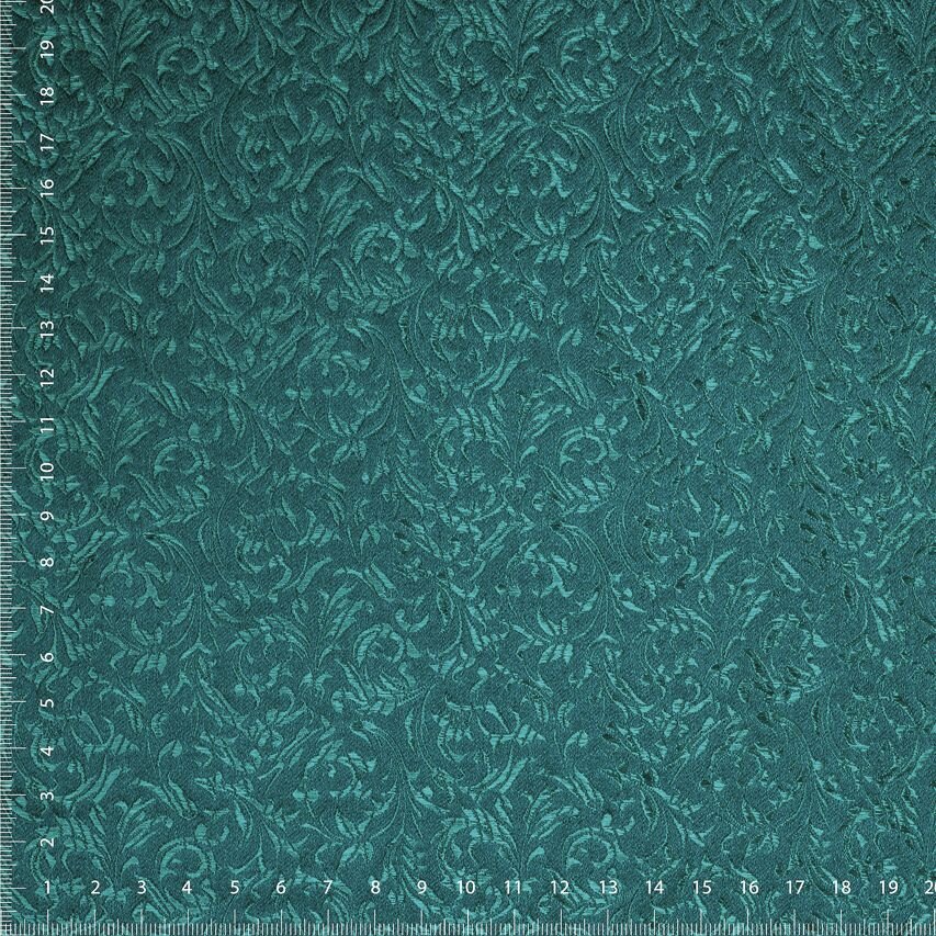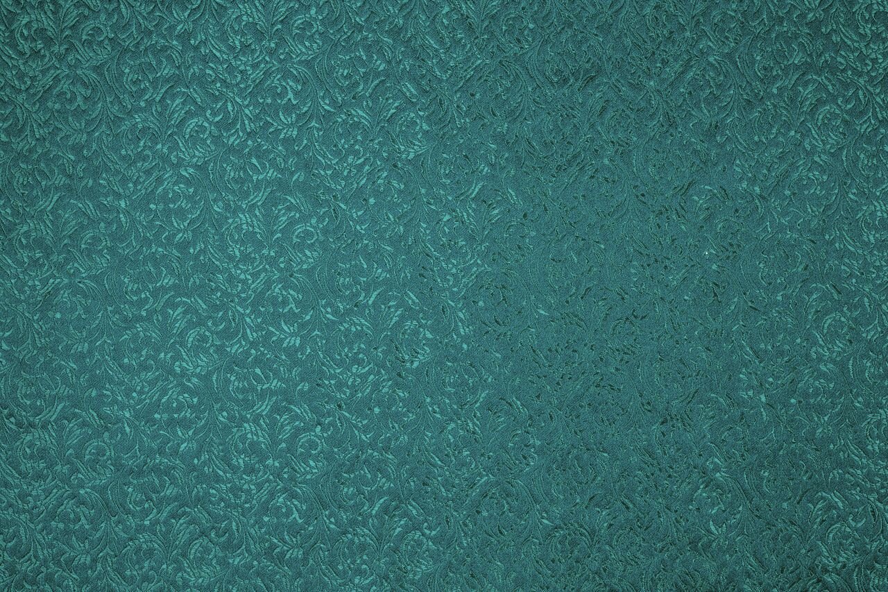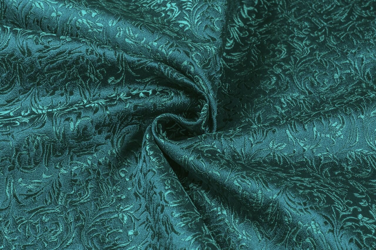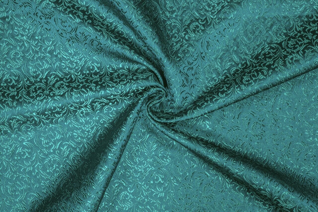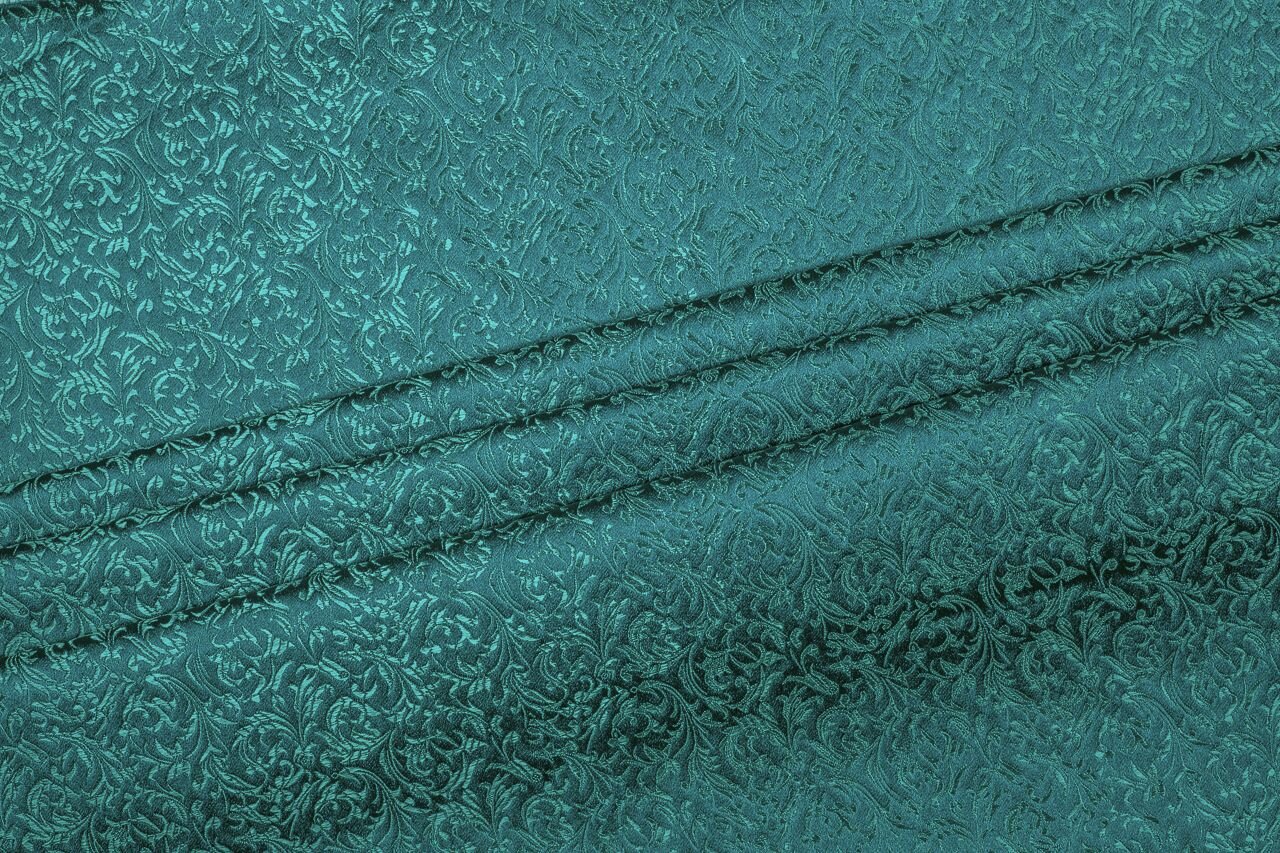 A sturdy, luxurious fabric with a detailed brocaded pattern in teal. This brocade has a moderately crisp hand, making it a good choice for tailored patterns that have to hold their shape. Use it for formal gowns, skirts, corsets or vests.