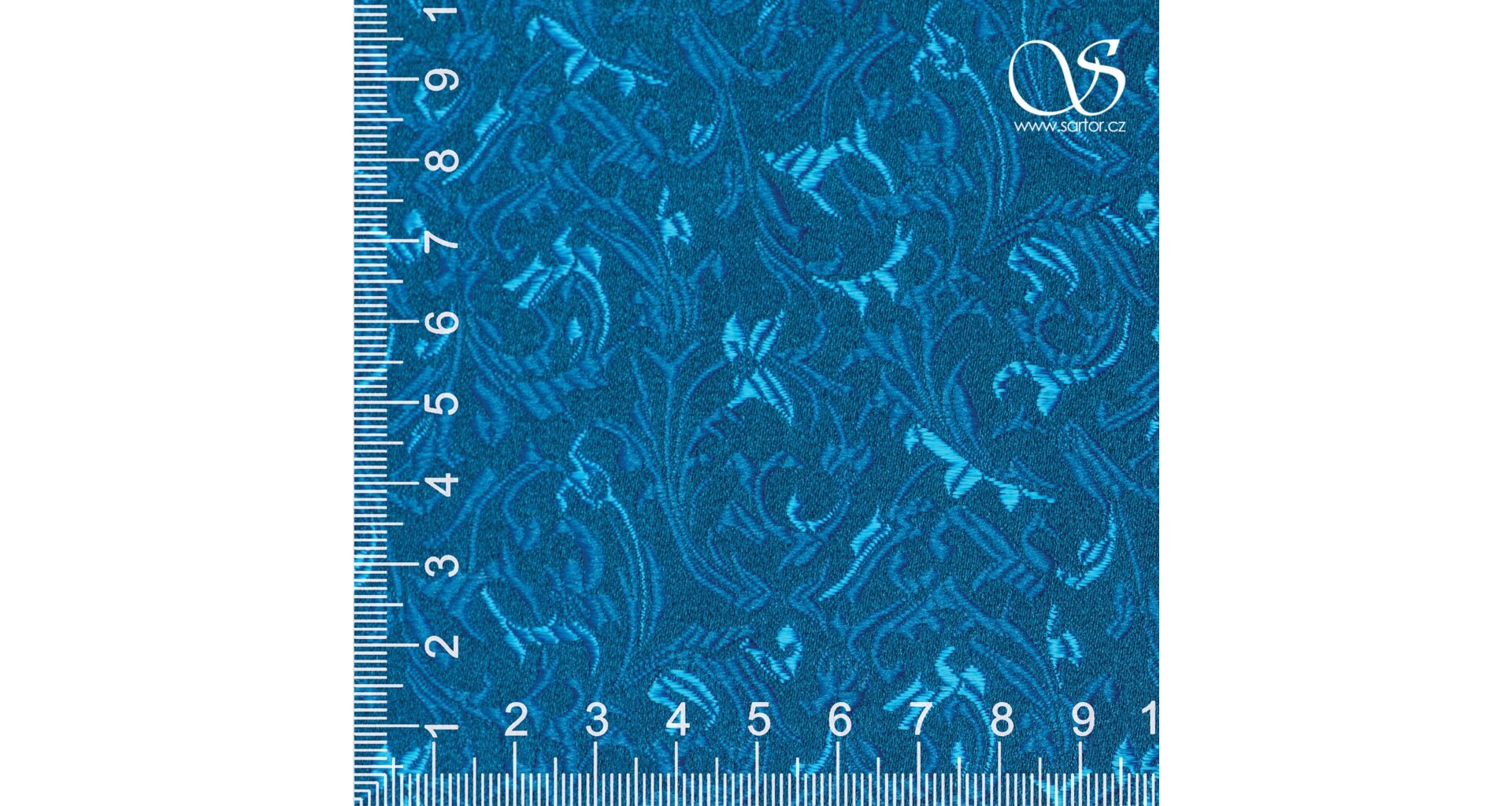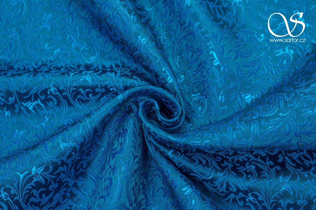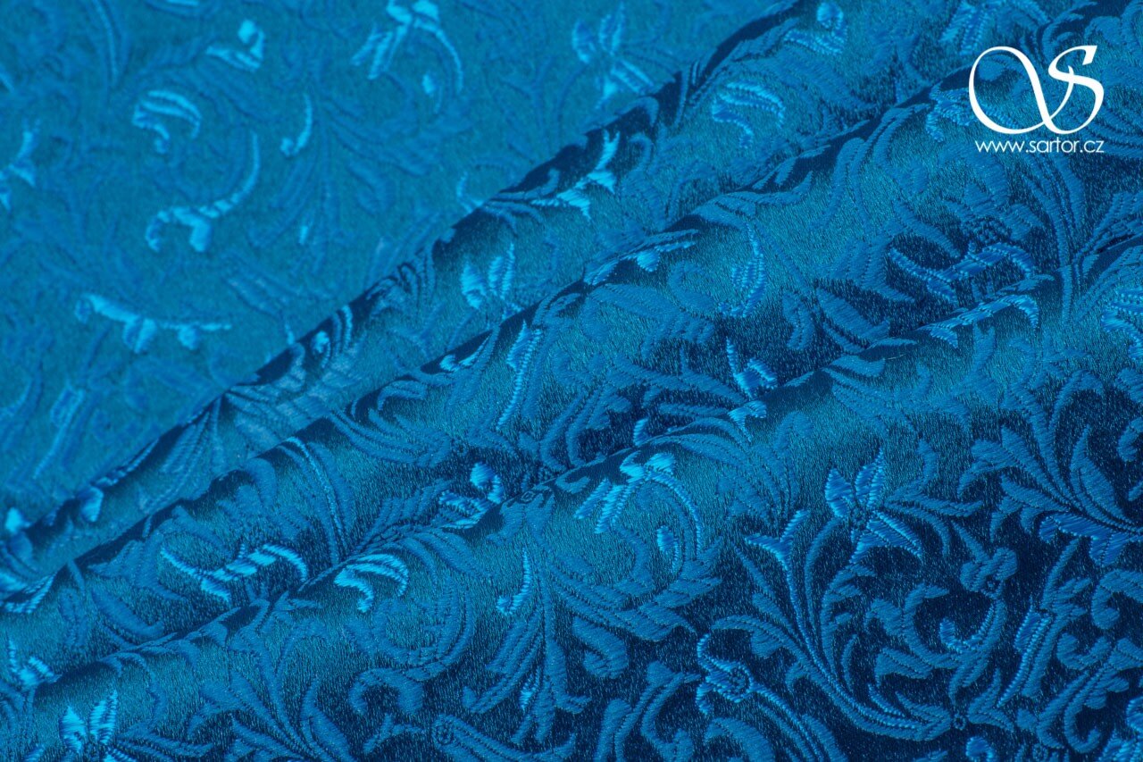 This turquoise brocade is a beautiful, opulent fabric created using the jacquard technique, which makes the production of highly detailed, woven patterns possible. Its intense colors, effective combination of matte and luster, and tactile surface, put it in a class of its own. Historically, brocade has always numbered among prestige fabrics, and that remains true to this day.