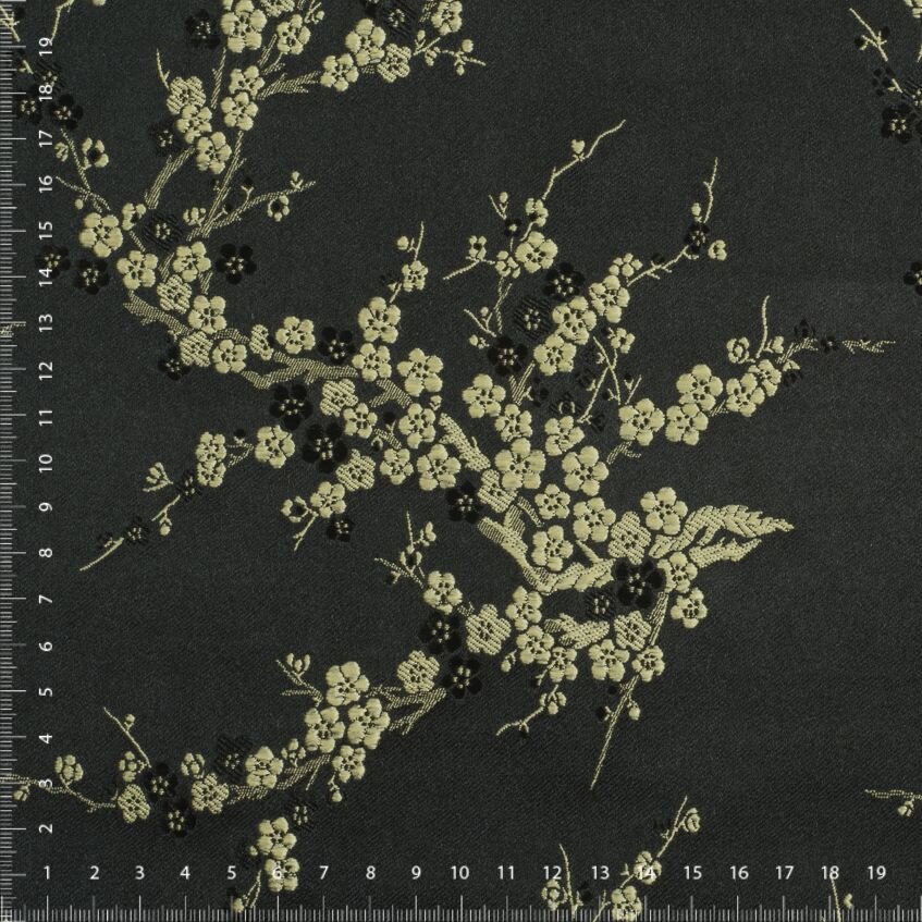 A sturdy, luxurious fabric with a detailed brocaded pattern in gold and black. This brocade has a moderately crisp hand, making it a good choice for tailored patterns that have to hold their shape. Use it for formal gowns, skirts, corsets or vests.