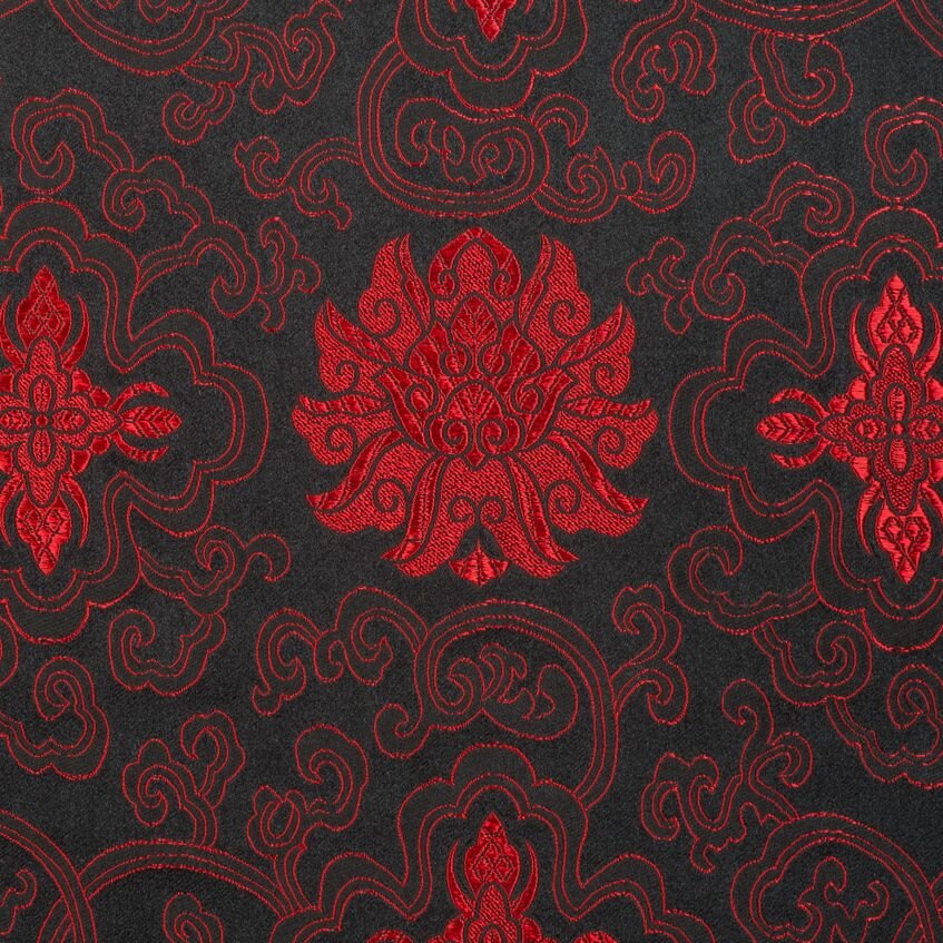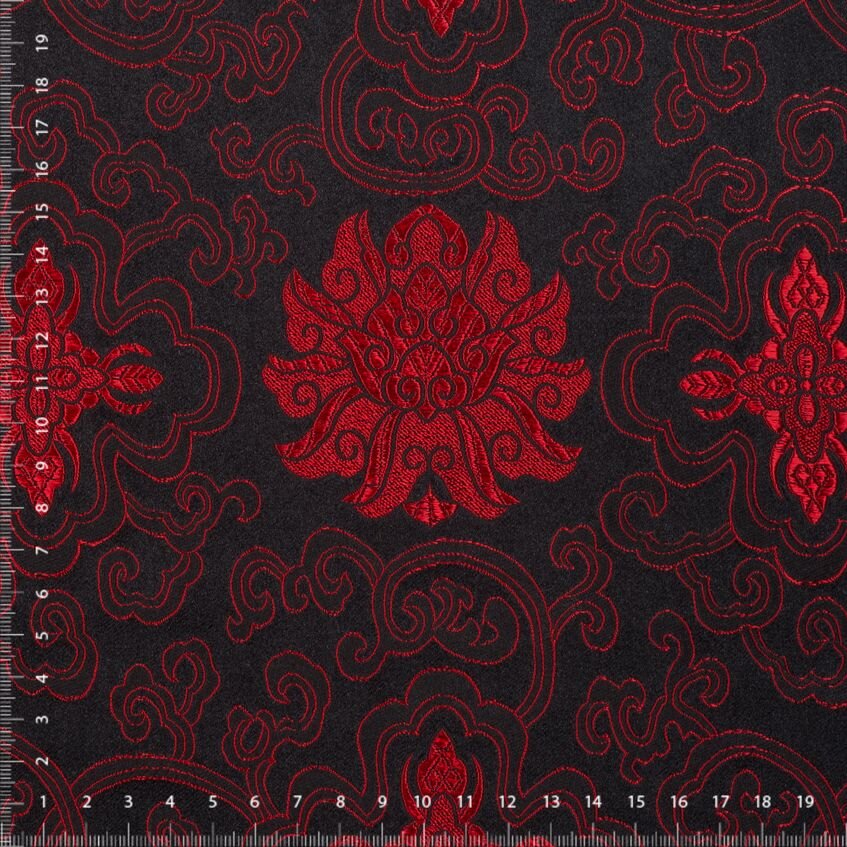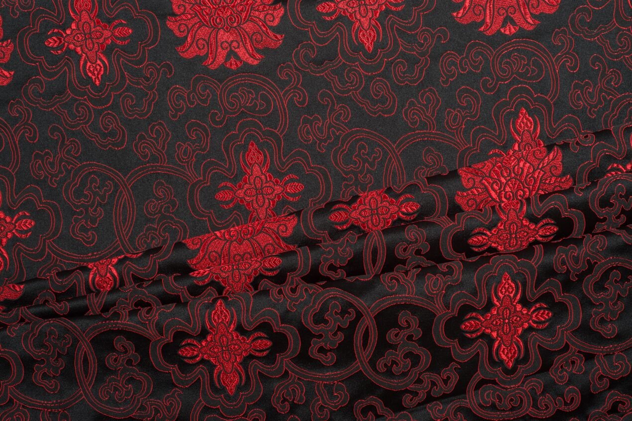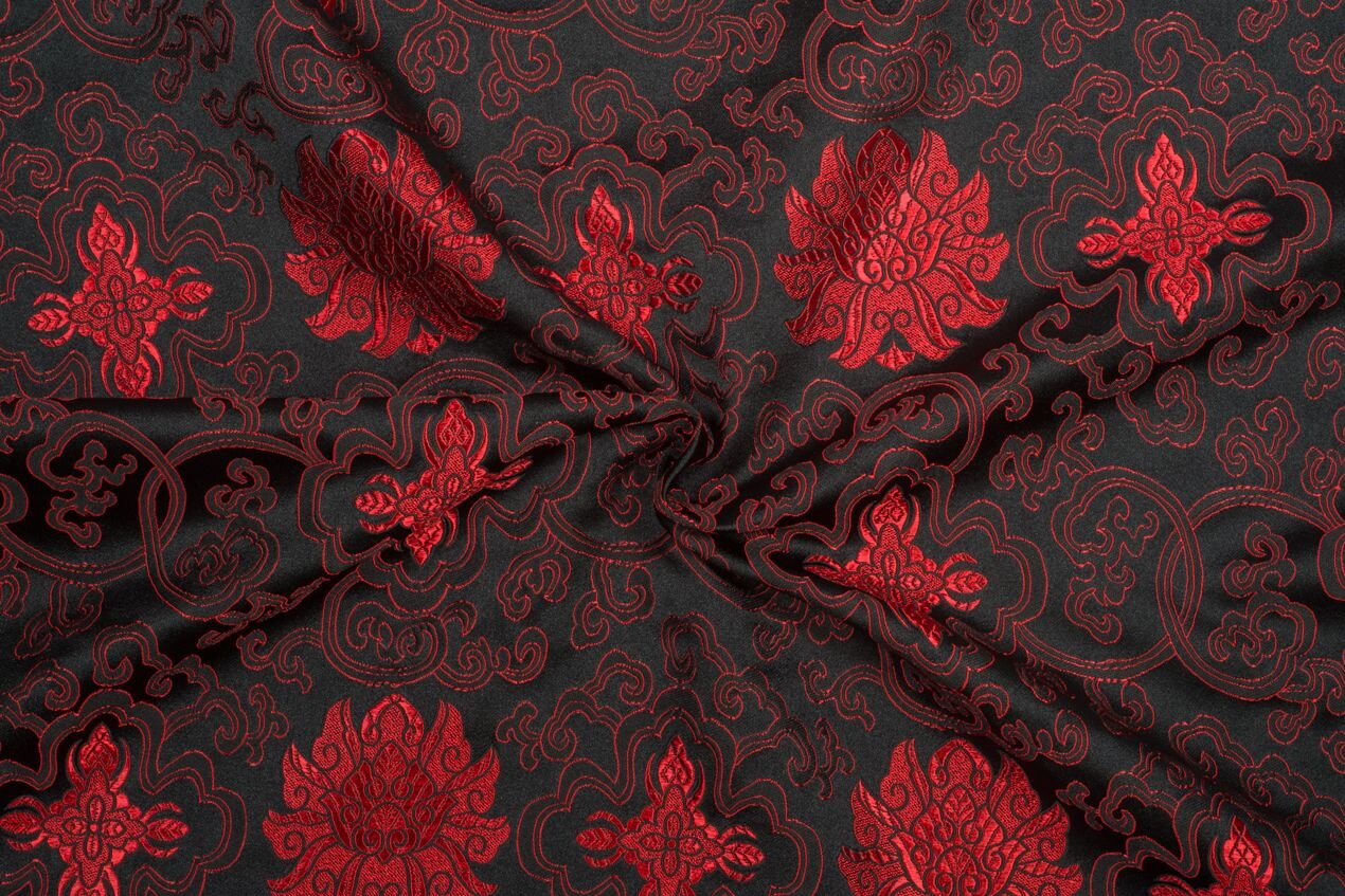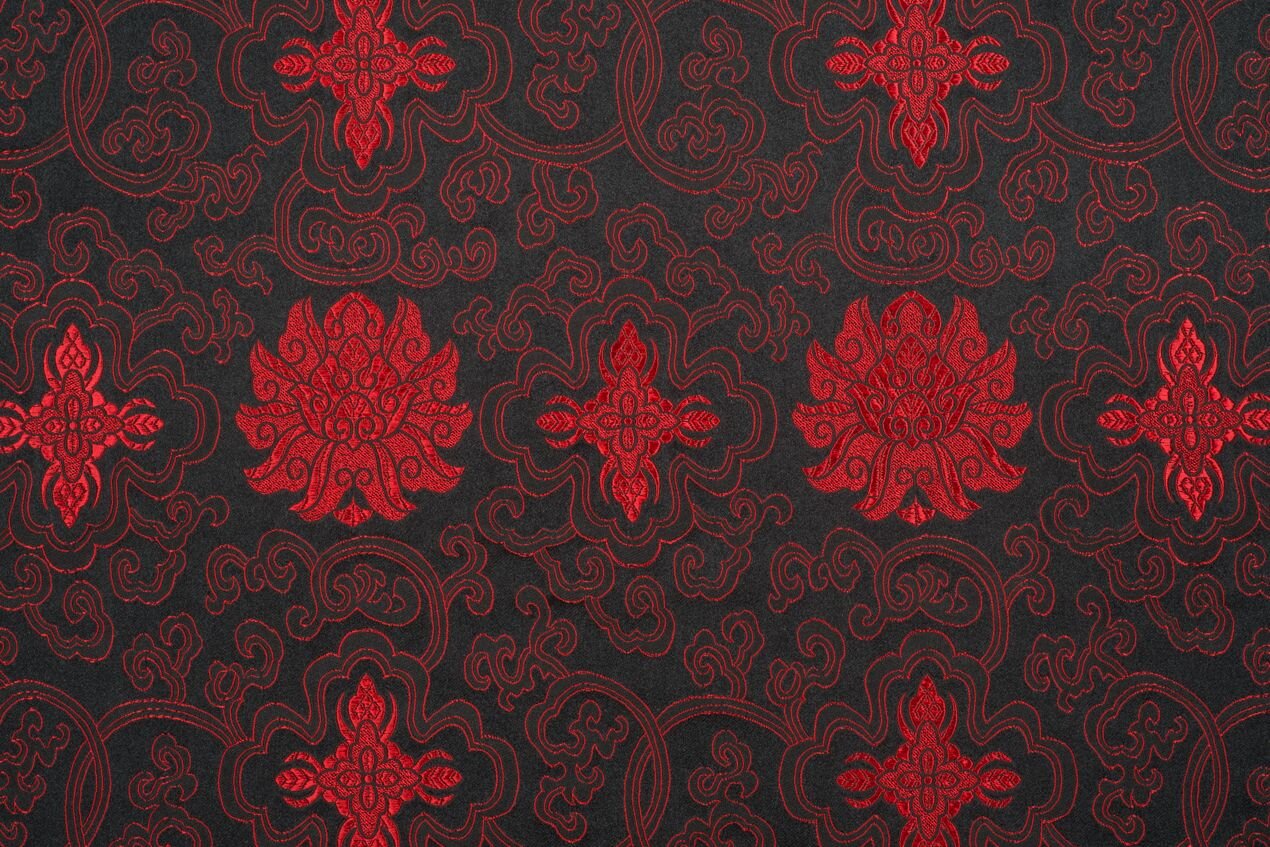 A sturdy, luxurious fabric with a detailed brocaded pattern in red and black. This brocade has a moderately crisp hand, making it a good choice for tailored patterns that have to hold their shape. Use it for formal gowns, skirts, corsets or vests.