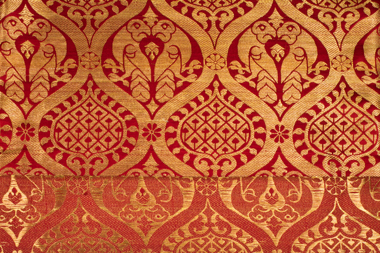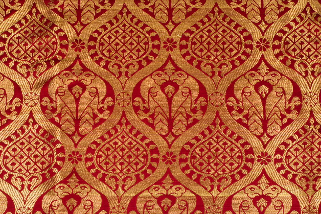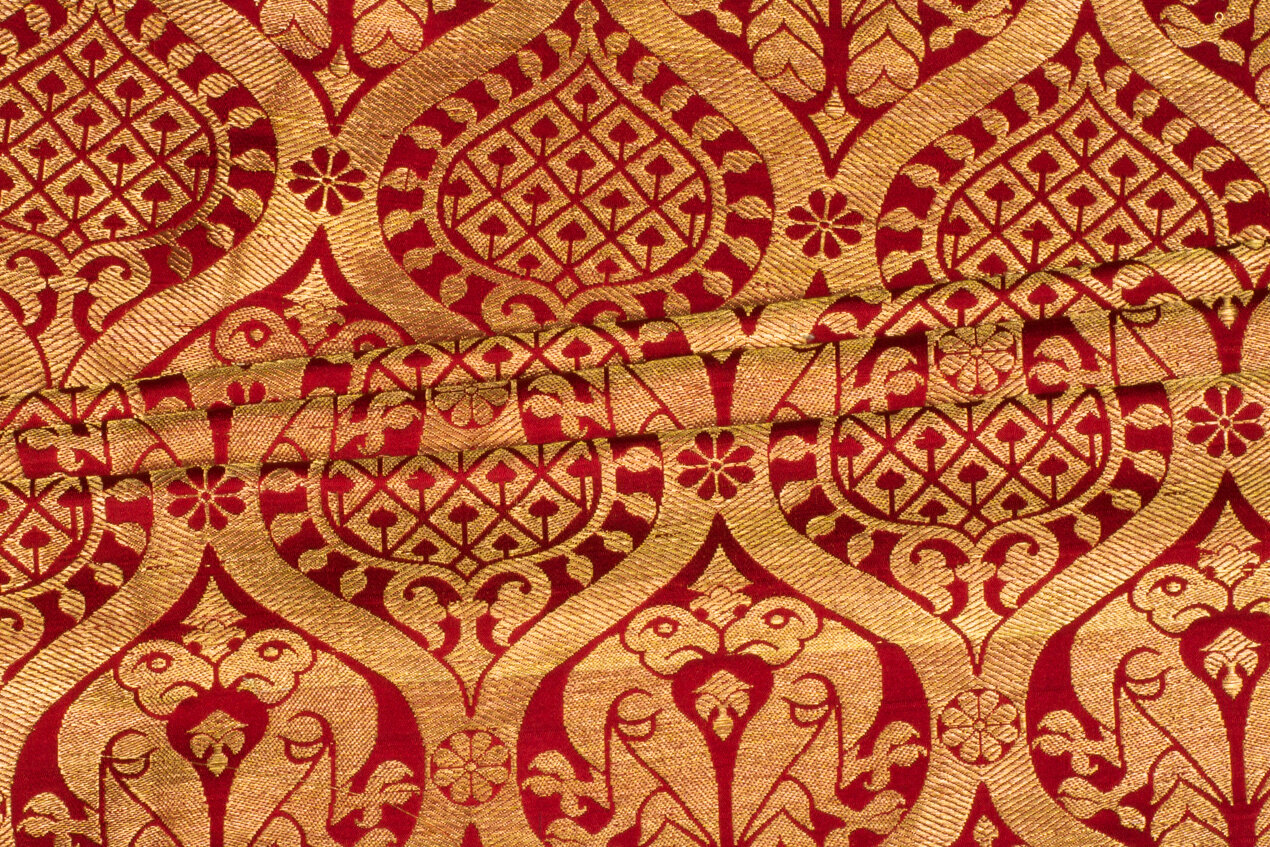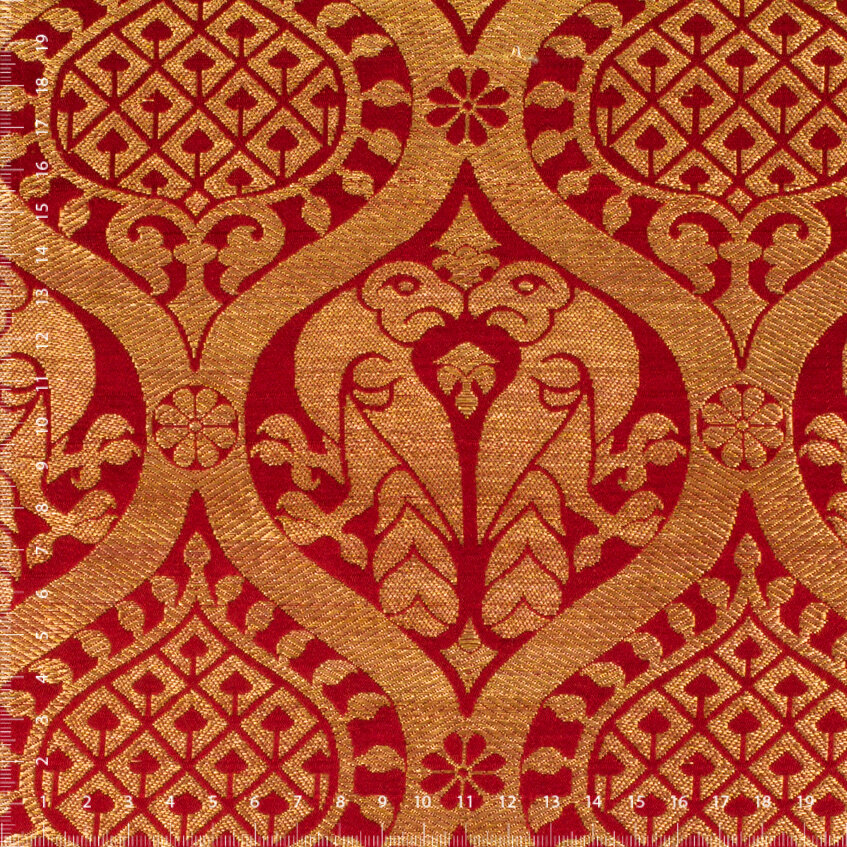 Hand woven reproduction of historical fabric from 13th century Regensburg Germany in genuine silk and gold thread. Gold pattern on a crimson red field. Perfect for historical costuming or to bring something special to modern interiors and fashions.
