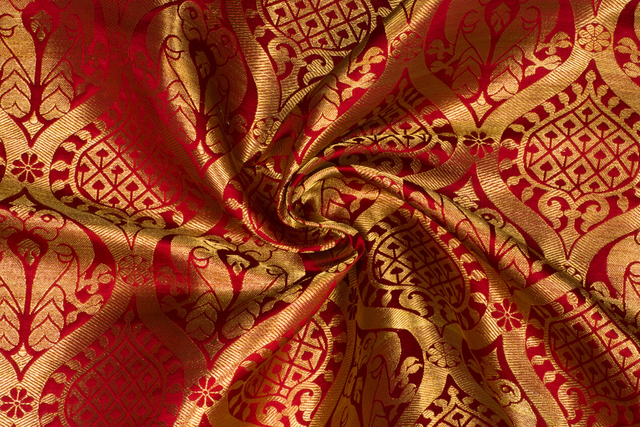 This historical brocade reproduction is woven by hand on a Jacquard loom in pure silk with genuine metallic threads toned with real gold. This combination of premium materials makes this brocade sturdy but soft, gentle to the touch, and breathable. The gold thread will not tarnish or lose its shine.