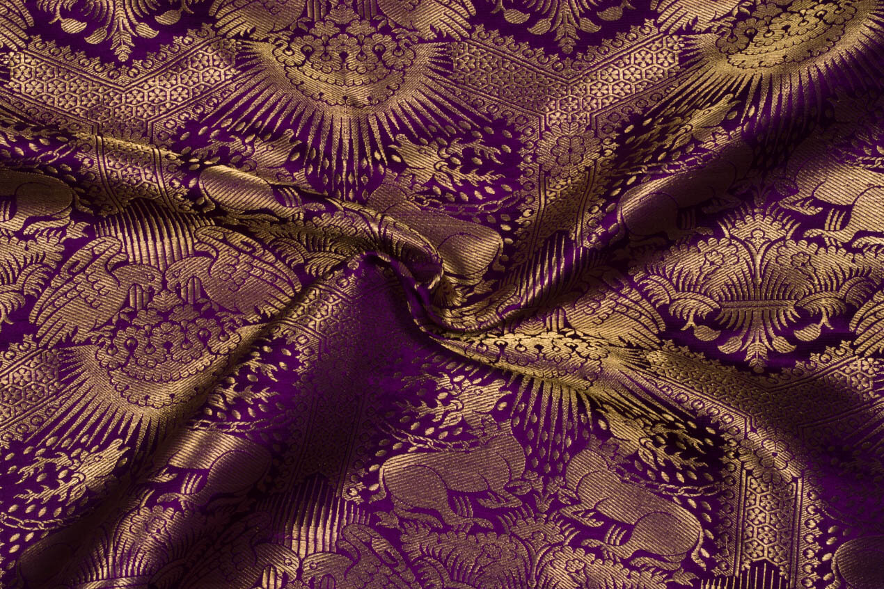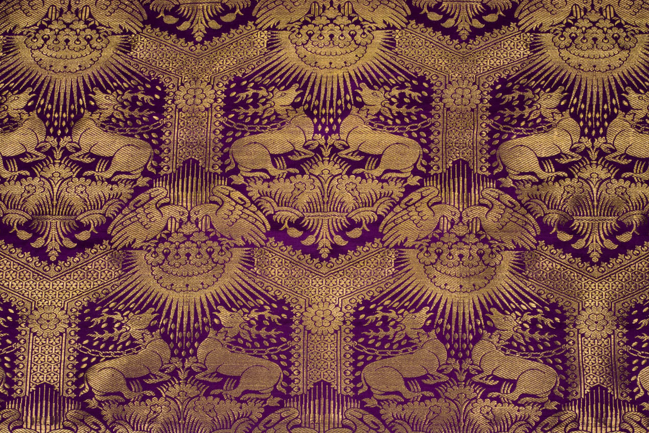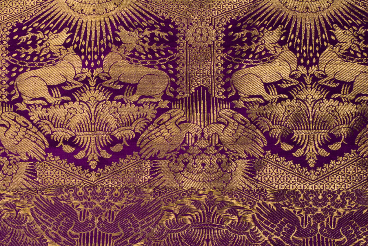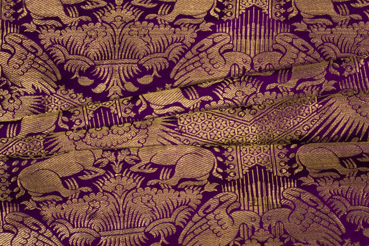 Hand woven reproduction of historical fabric from 15th century Italy in genuine silk and gold thread. Gold pattern on a purple field. Perfect for historical costuming or to bring something special to modern interiors and fashions.