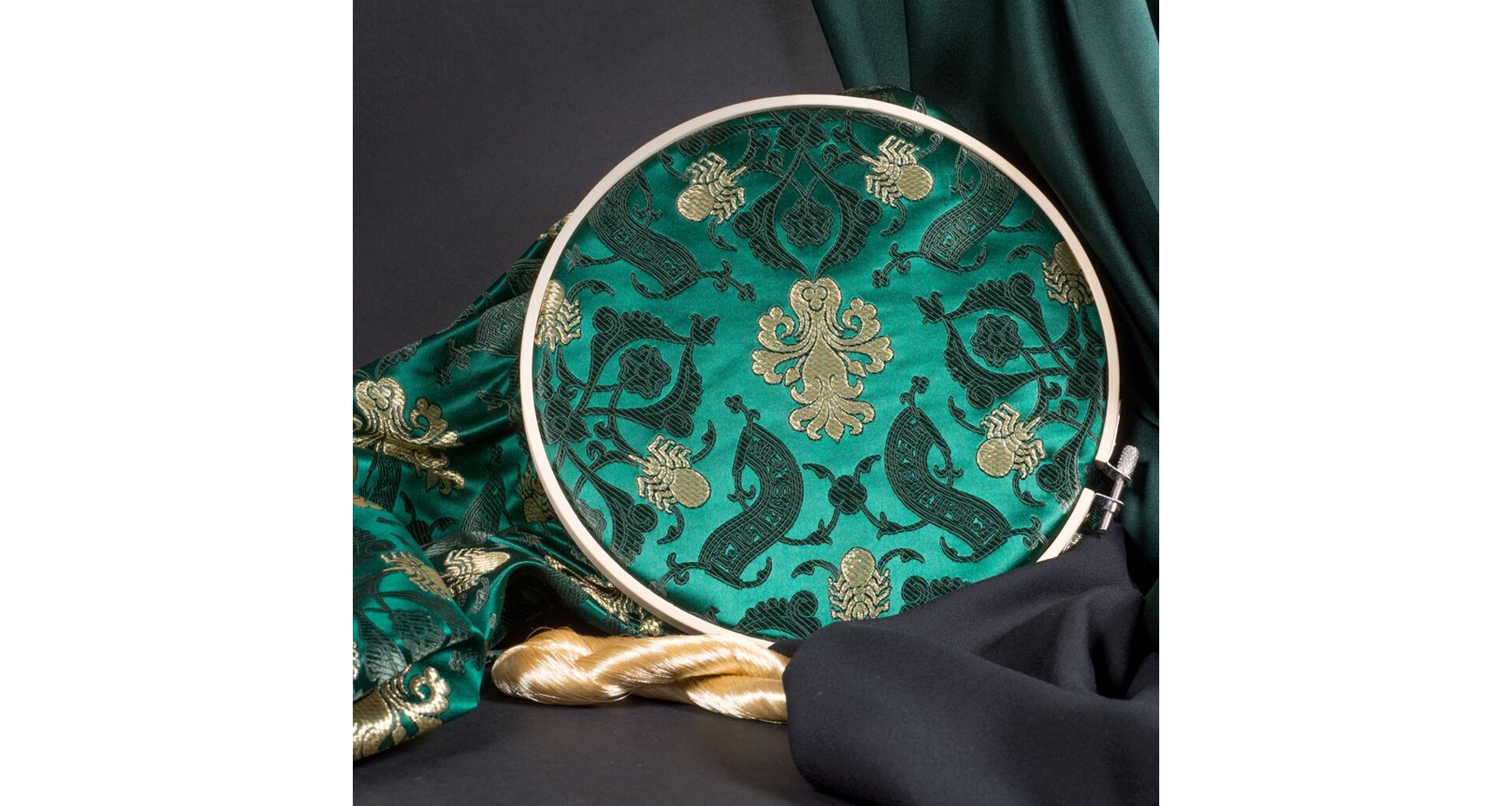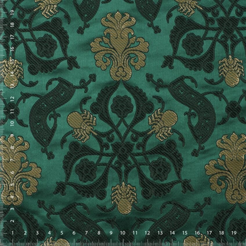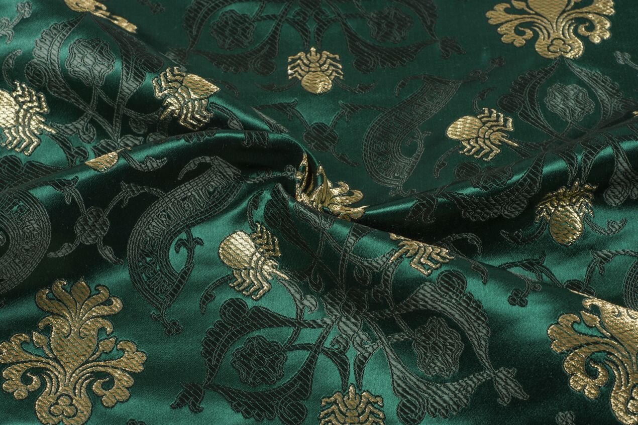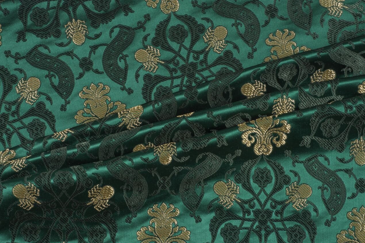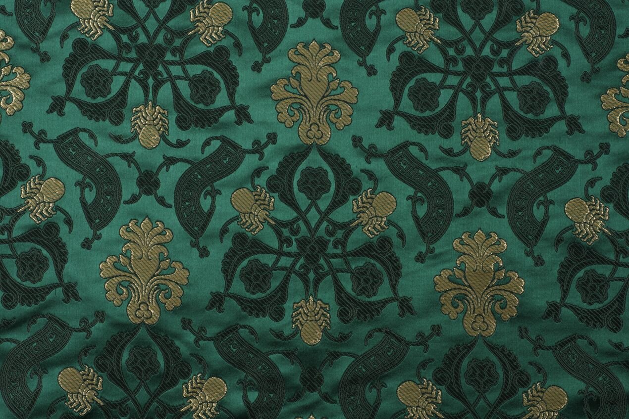Reproduction fabric of a medieval textile from the 14th century, in natural silk and rayon. Green brocade with gold thread. Perfect for historical costuming as well as modern interiors and contemporary fashions.