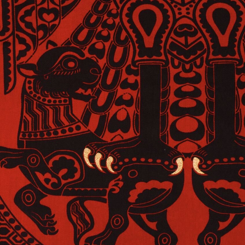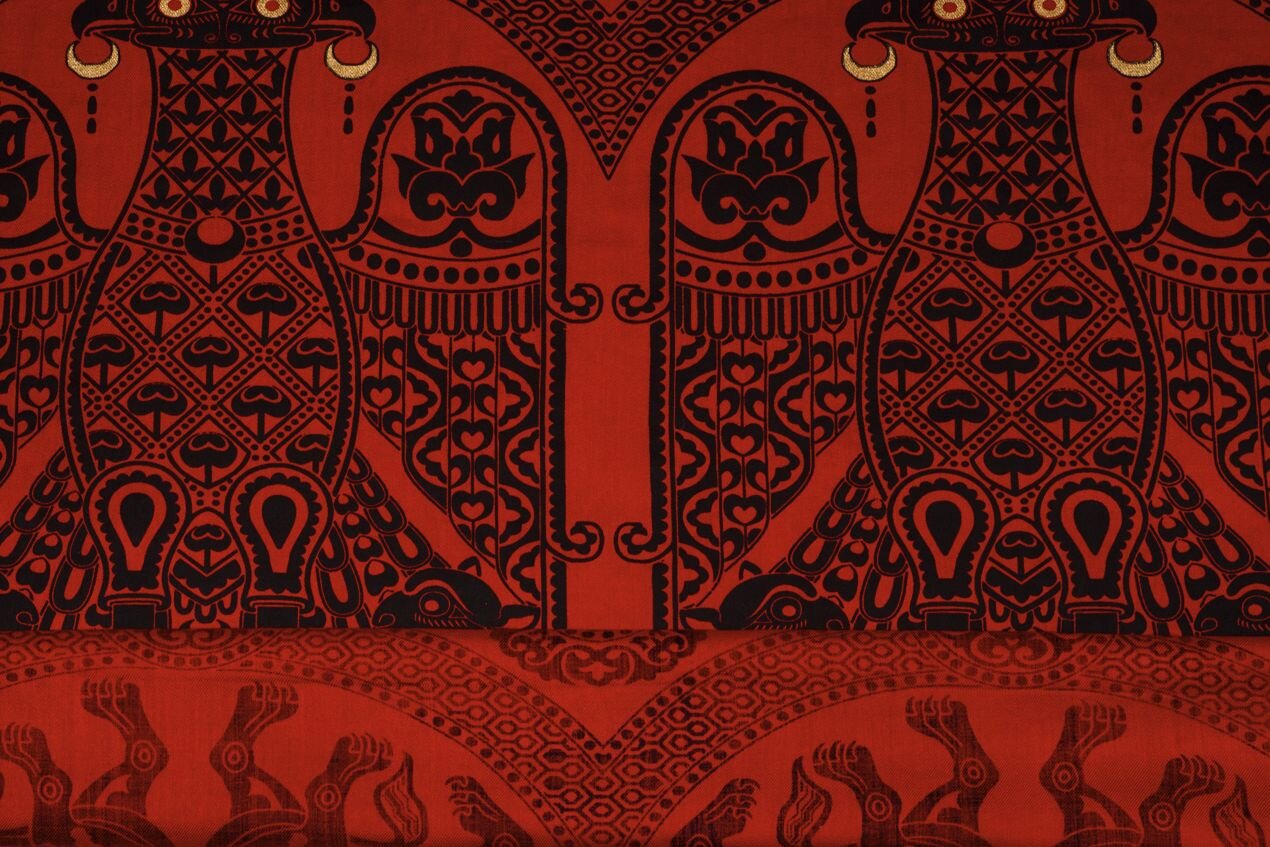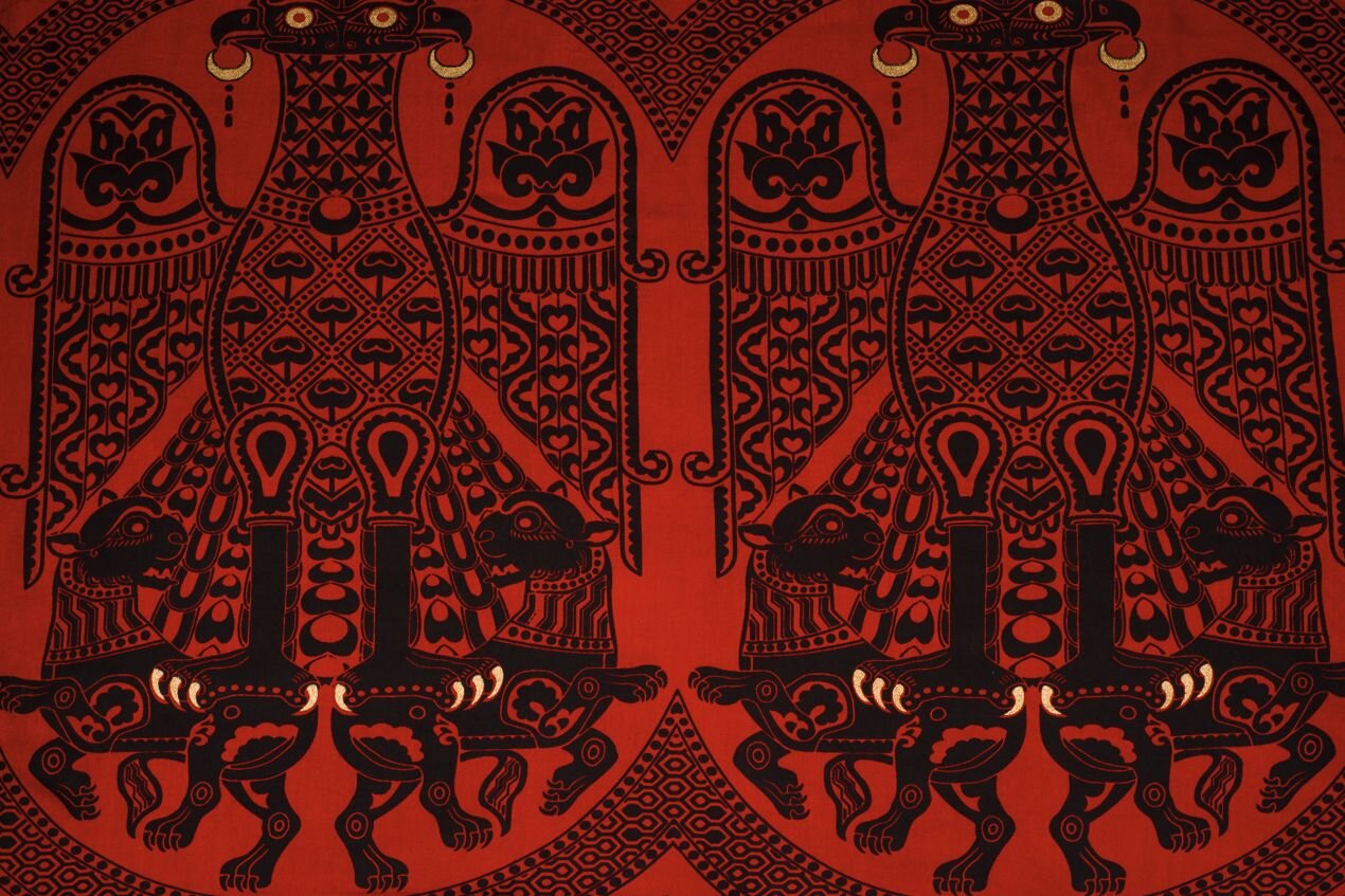 This historical fabric motif depicts a double-headed eagle with lions clasped in its talons. An example of the masterful textile craft of the 11th–12th centuries, the original silk fabric that inspired our reproduction comes from the tomb of Saint Bernard Calvo, Bishop of Vich in Catalonia, who died in 1243. The fabric is now in the collections of the Metropolitan Museum of Art in New York and the Musée des Tissus in Lyon, France.