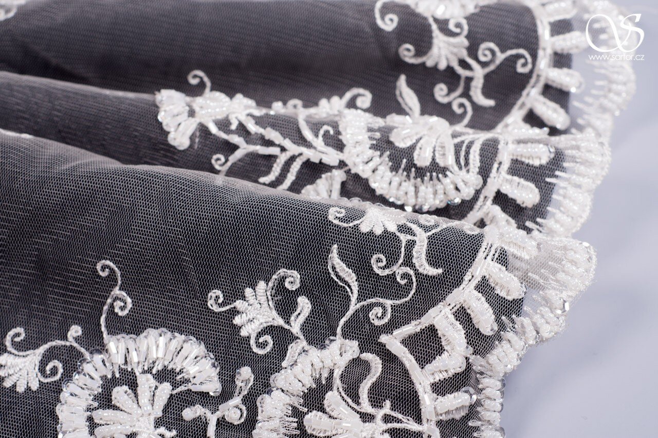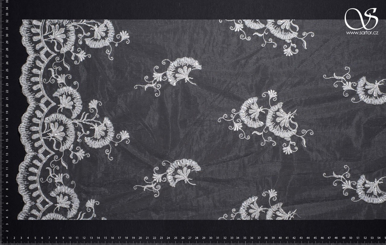 Lace embroidered on a fine tulle base, the pattern edged with a fine cord for a dramatic, three-dimensional look, and with a decorative selvage on both sides. This beaded lace in ivory makes for a great wedding lace.
