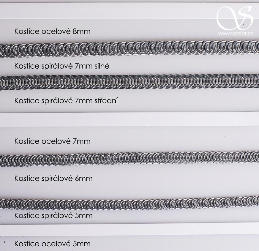 Spiral boning is formed of a continuous, flattened spring of galvanized steel wire. It holds as firmly as flat steel boning, but its clever construction allows it to flex in multiple directions, making it useful in curves and on the diagonal. It also works well at the sides of a corset, because it can emphasize the waistline without putting too much stress on the lower ribs. It is not suitable for places where a straight, rigid line is needed, such as along lacing lines.