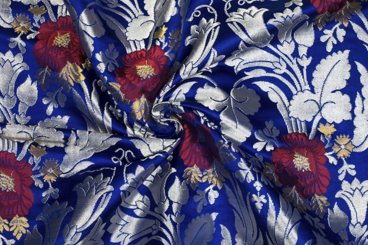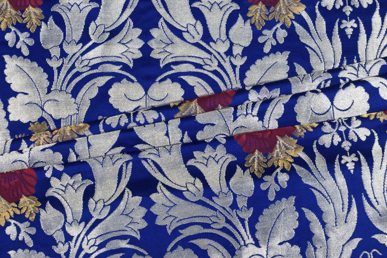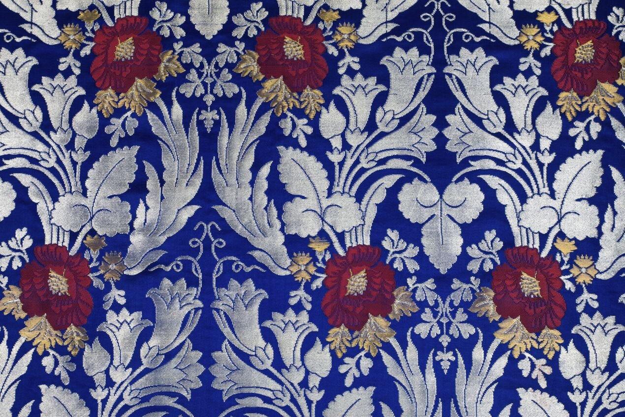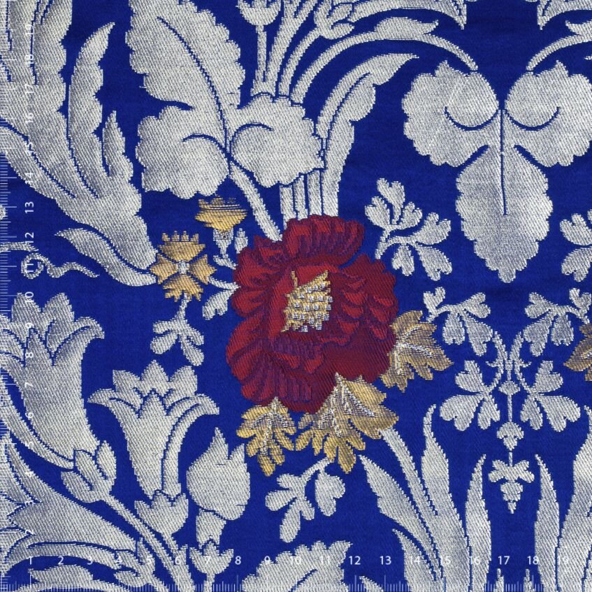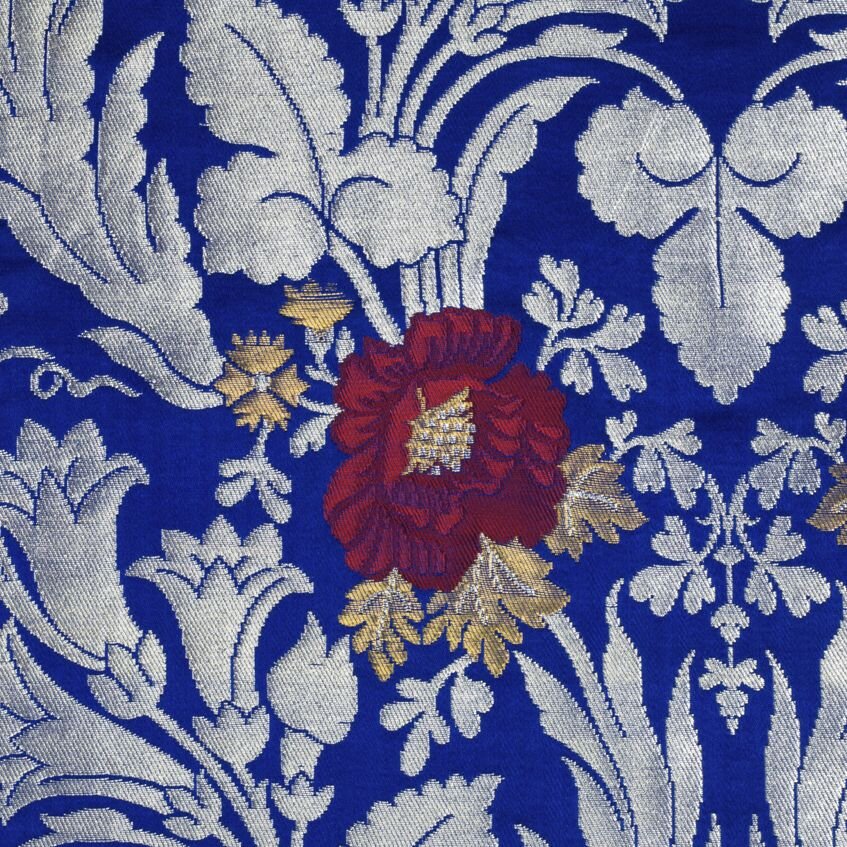 This brocade is inspired by a 19th century silk brocade used in Bohemian and Slovakian folk costumes, or kroj. Hand woven of silk, and real metallic thread, the fabric is of blue color silk with a woven floral pattern in silver featuring scarlet flowers and silver leaves.