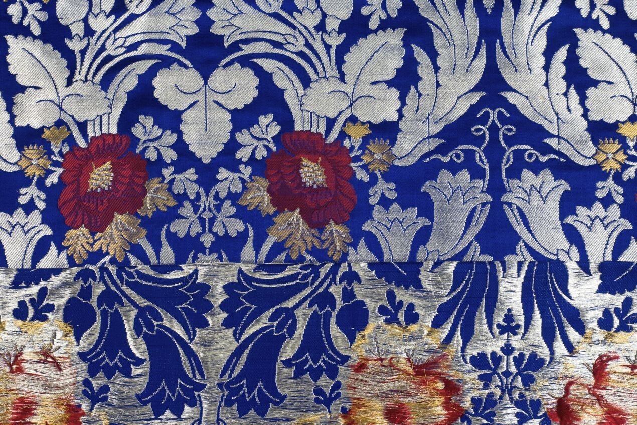 This historical brocade reproduction is woven by hand on a Jacquard loom in pure silk with genuine metallic threads toned with real silver. This combination of premium materials makes this brocade sturdy but soft, gentle to the touch, and breathable. The gold thread will not tarnish or lose its shine.
