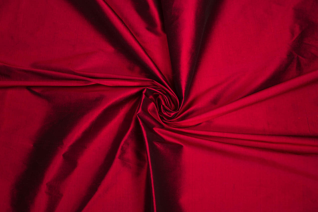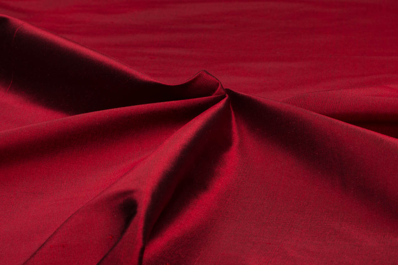 A crisp natural silk fabric in crimson with a very subtle slub, quite similar to shantung, silk dupioni is a popular choice for formalwear and bridal fashions but also works well in everyday pieces and accessories.