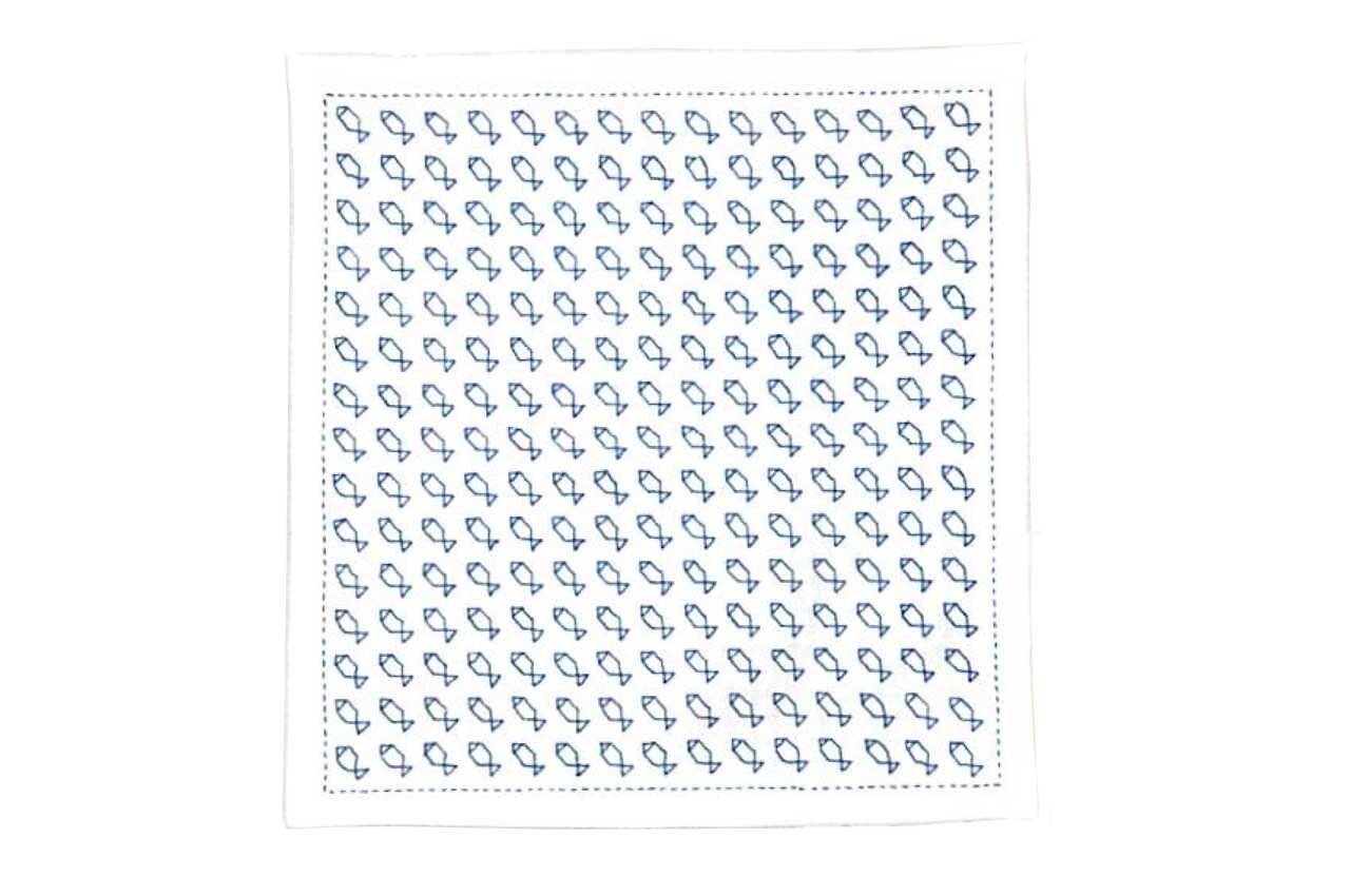 This little stylized fish in dark blue is a simple, modern design. Sew in straight vertical, horizontal, and diagonal lines.