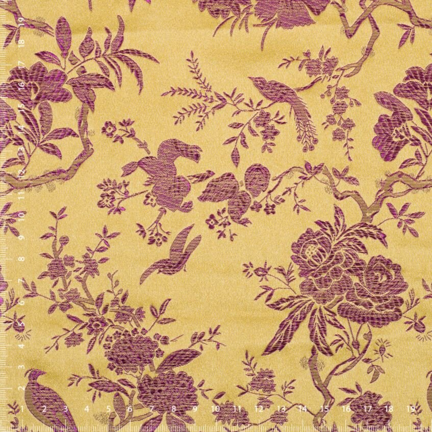 A sturdy, luxurious fabric with a detailed brocaded pattern in gold and violet. This brocade has a moderately crisp hand, making it a good choice for tailored patterns that have to hold their shape. Use it for formal gowns, skirts, corsets or vests.