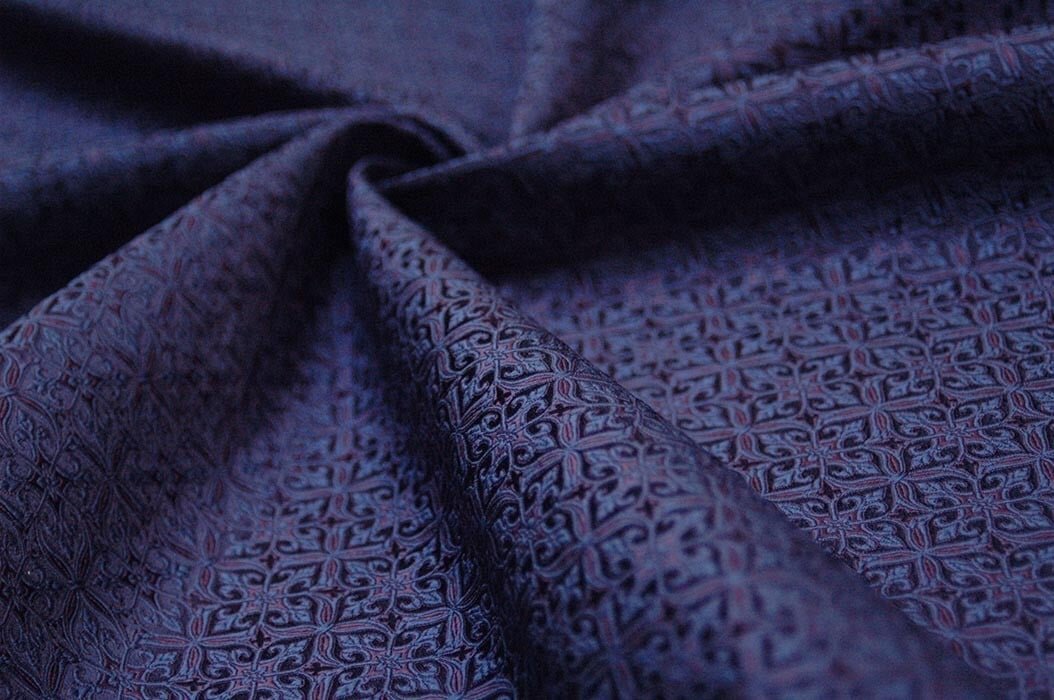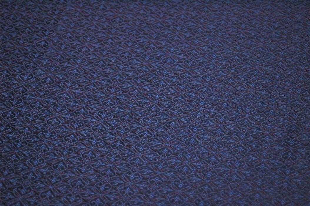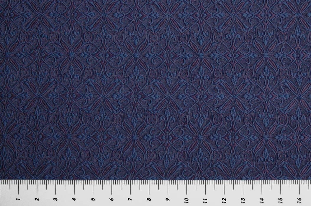 A sturdy, luxurious fabric with a detailed brocaded pattern in dark blue. This brocade has a moderately crisp hand, making it a good choice for tailored patterns that have to hold their shape. Use it for formal gowns, skirts, corsets or vests.