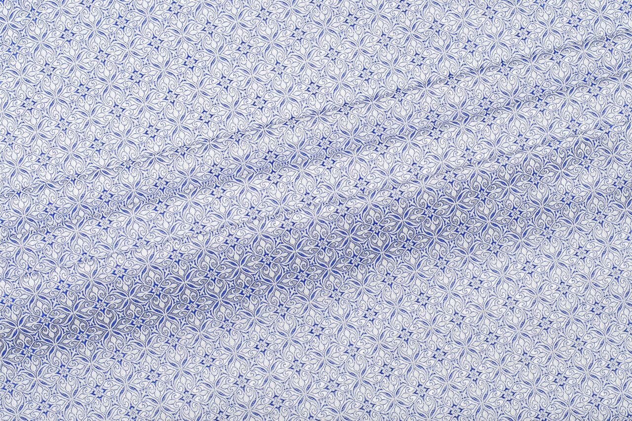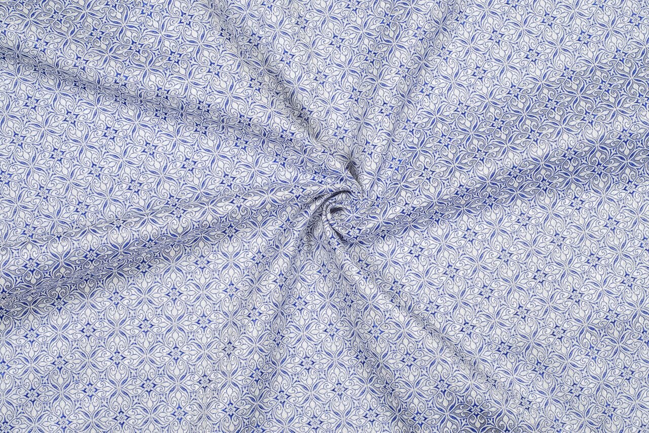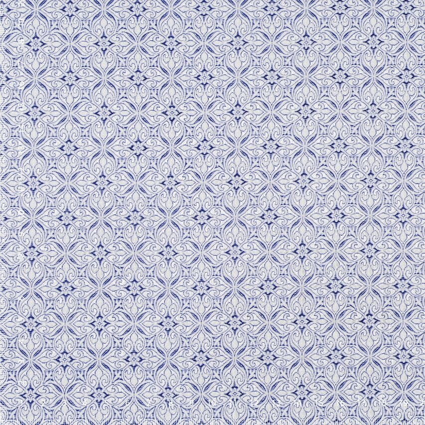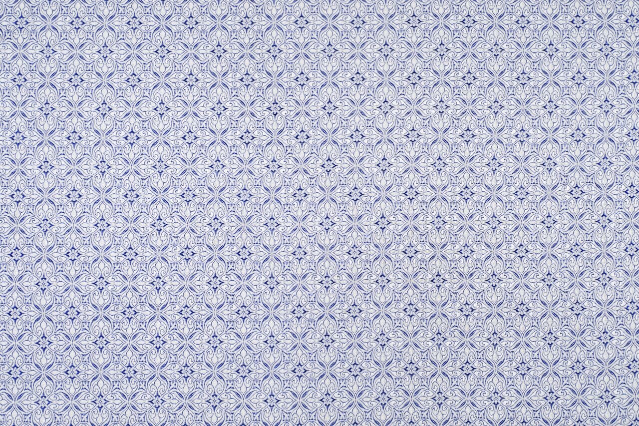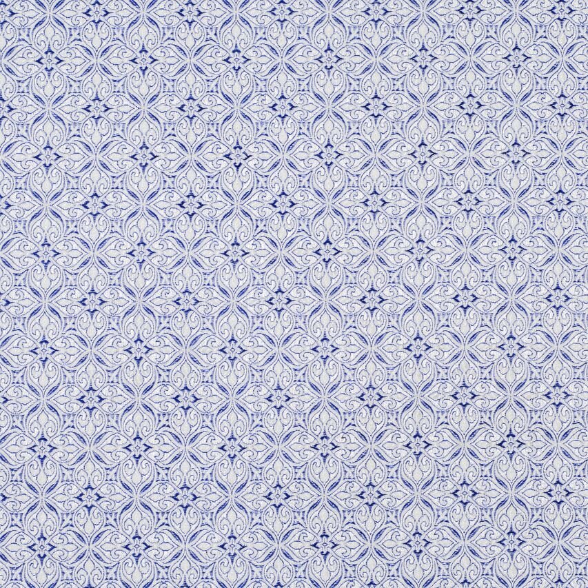 A sturdy, luxurious fabric with a detailed brocaded pattern in blue and white. This brocade has a moderately crisp hand, making it a good choice for tailored patterns that have to hold their shape. Use it for formal gowns, skirts, corsets or vests.