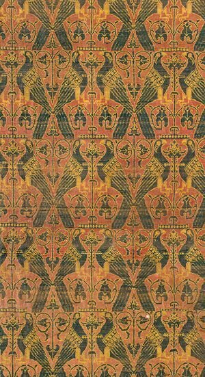 A shrine there was consecrated to him and decorated with this original textile. The saint’s relics were wrapped in the same exquisite red silk adorned with rows of facing green and gold birds.