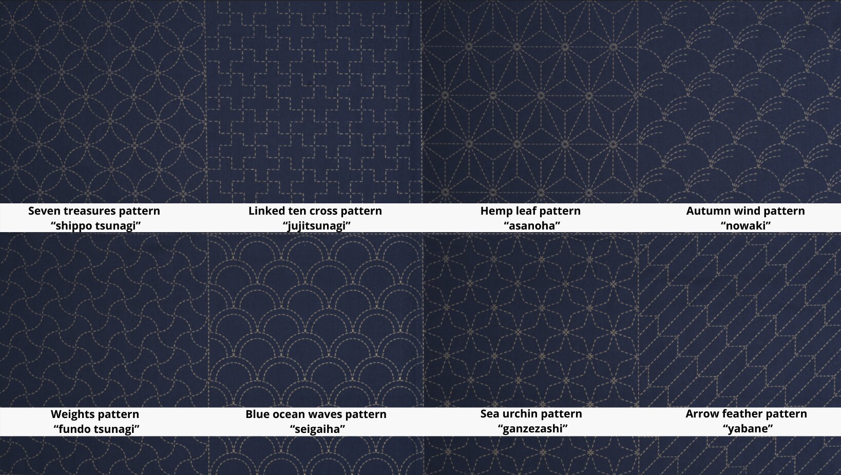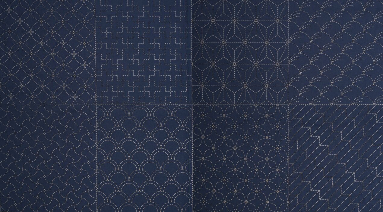 Each panel includes the following traditional sashiko patterns: