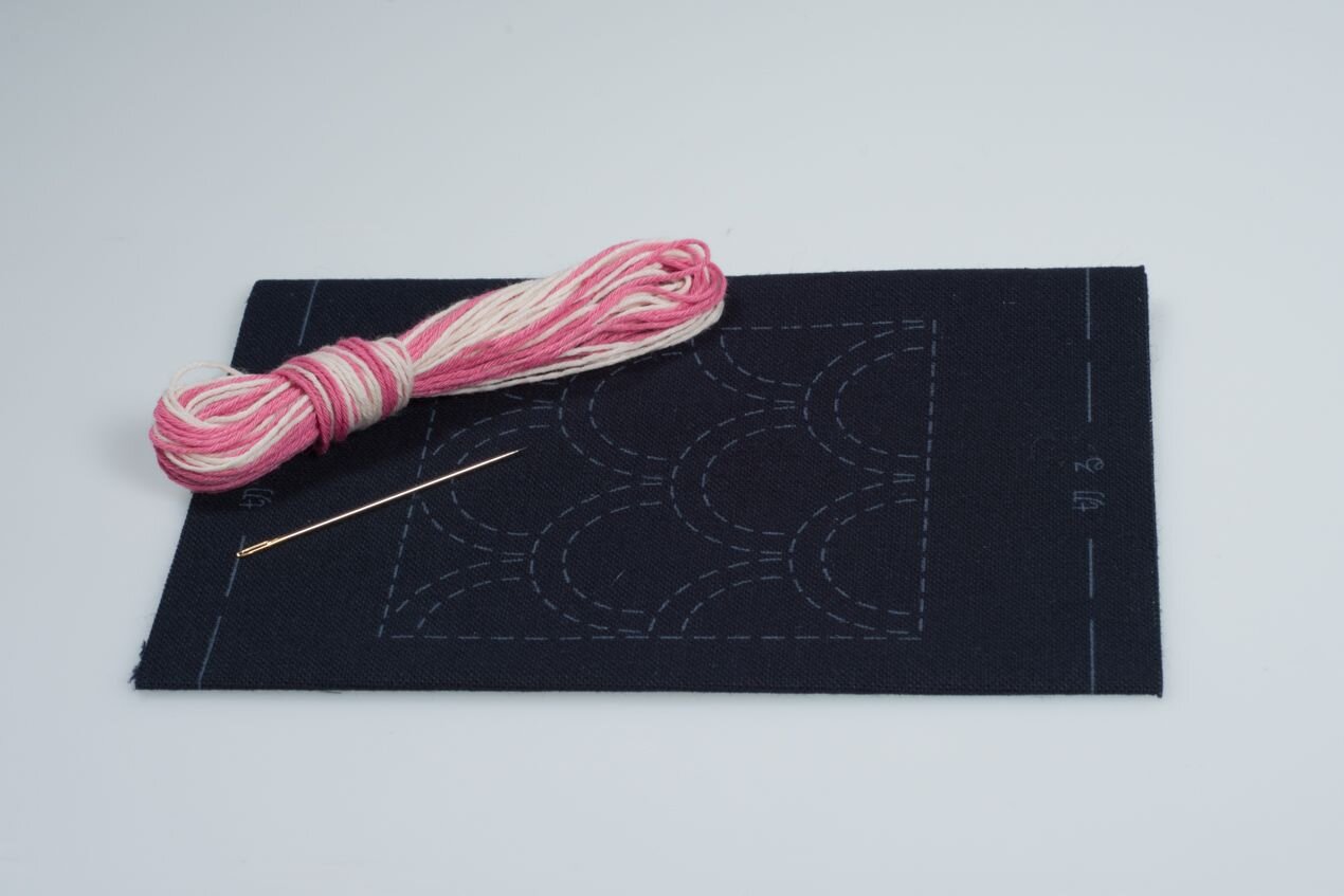 Set of two small sashiko squares includes blue fabric square with pre-printed stitching pattern, thread in two colors, needle, and instructions. Perfect introduction to sashiko stitching rewards you with a pretty keepsake.