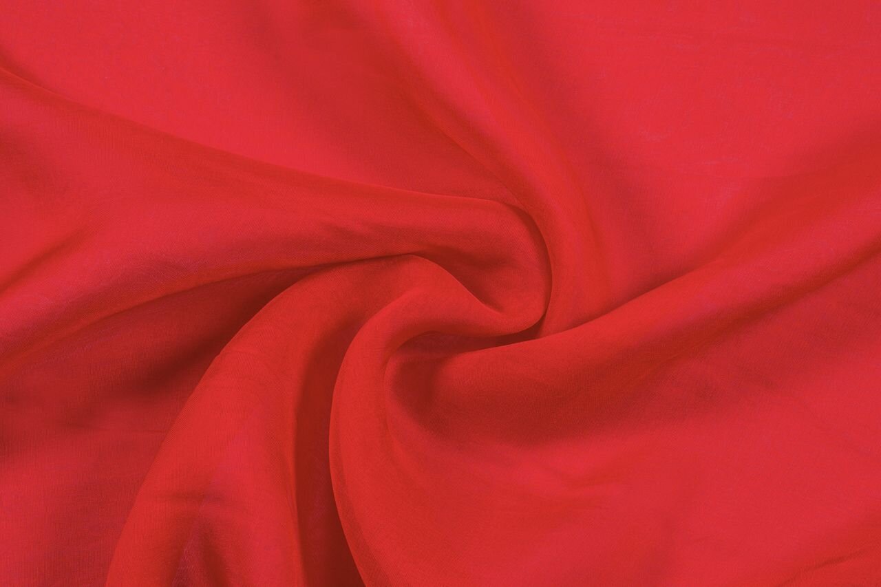 This red silk chiffon is wonderfully sheer. Light and diaphanous, it drapes beautifully and flows gracefully with every movement. Show it off in full-length, layered dresses or pantsuits, romantic trains, wide sleeves, evening gowns and wraps. If you are aiming for a fairy princess wedding gown, silk chiffon is just the thing.