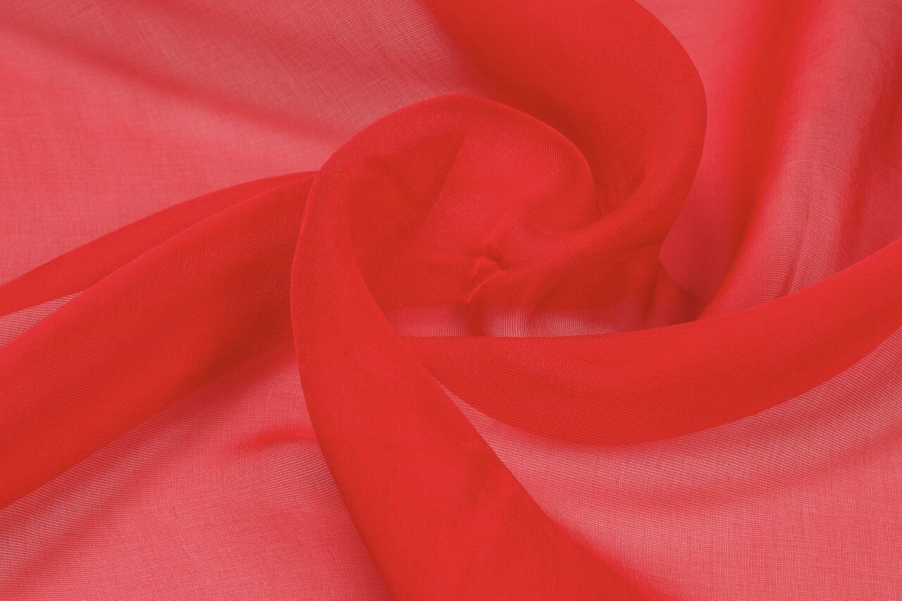 This red silk chiffon is wonderfully sheer. Light and diaphanous, it drapes beautifully and flows gracefully with every movement. Show it off in full-length, layered dresses or pantsuits, romantic trains, wide sleeves, evening gowns and wraps. If you are aiming for a fairy princess wedding gown, silk chiffon is just the thing.