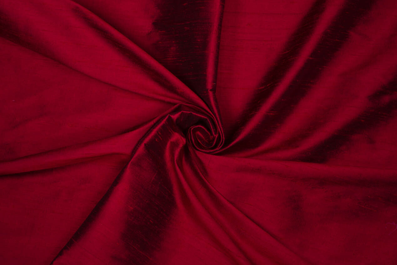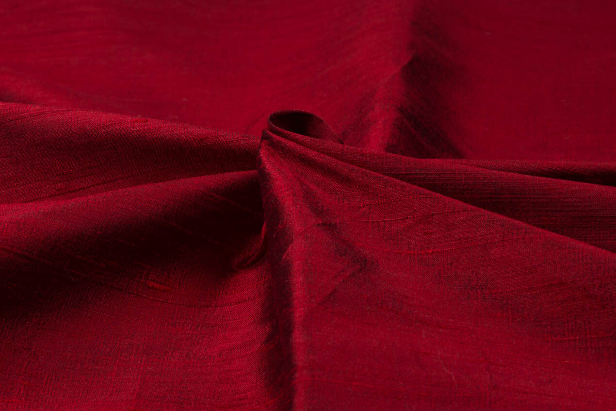A sturdy natural silk fabric in crimson with a distinctive, irregular slubbed texture, dupioni is a popular choice for formalwear and bridal fashions. Comfortable and breathable, it also works well for everyday wear and even looks great in pillowcases and accessories. Dupioni is woven from threads of varying thickness. This lends the resulting cloth a unique appearance prized by many. At the same time, it means that fabric weight may vary slightly from piece to piece.